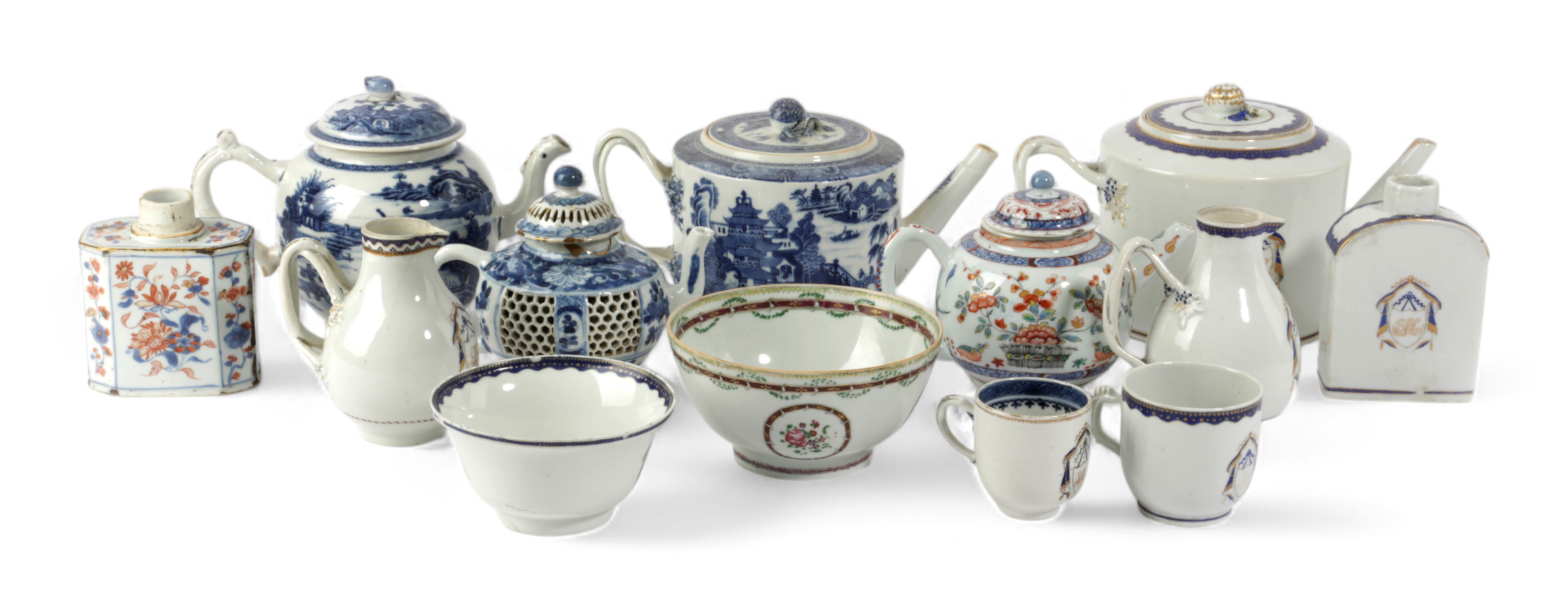 to include a part armorial tea set, other teapots and covers, tea canisters and bowls (13)