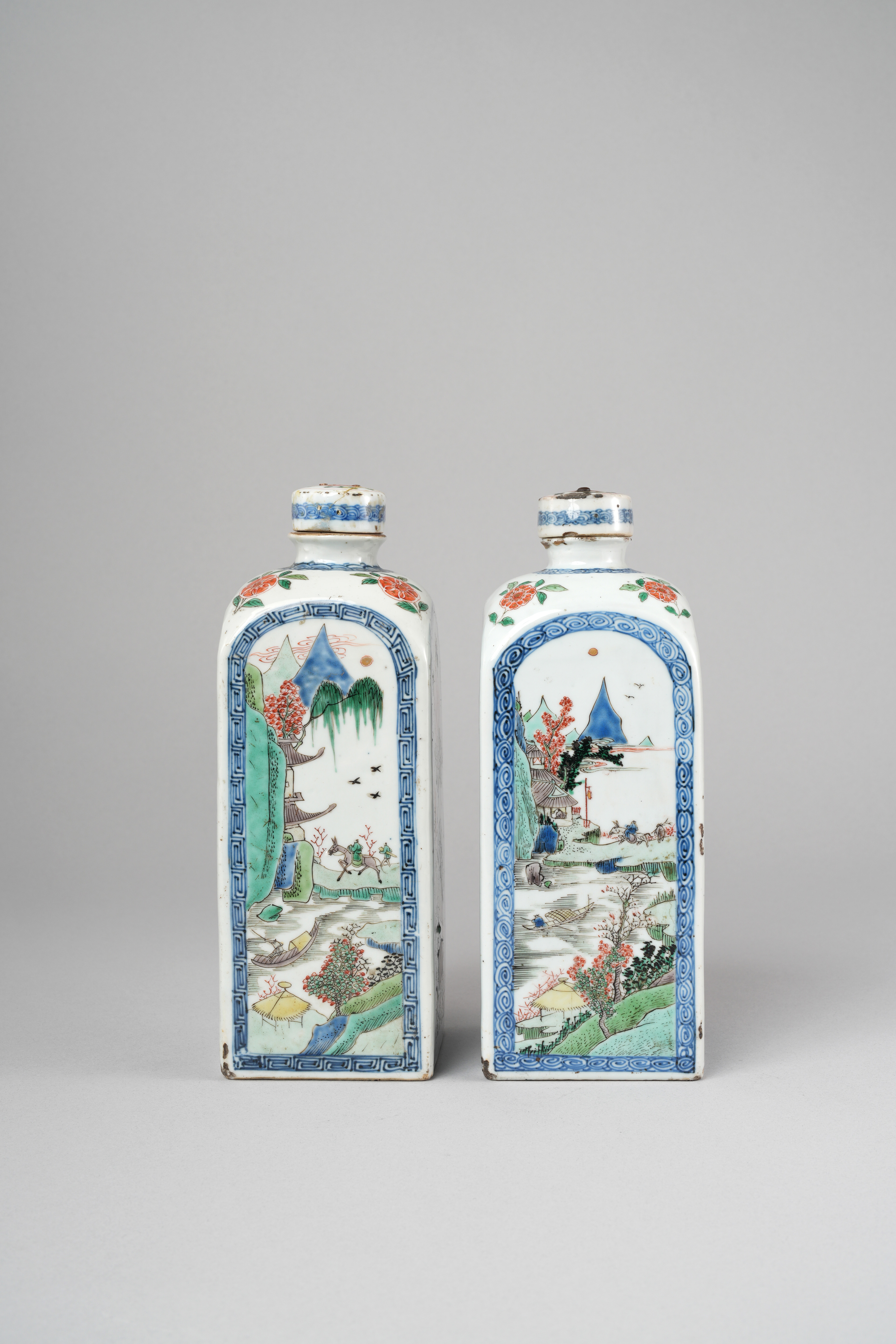 A PAIR OF CHINESE FAMILLE VERTE SQUARE-SECTION FLASKS AND COVERS