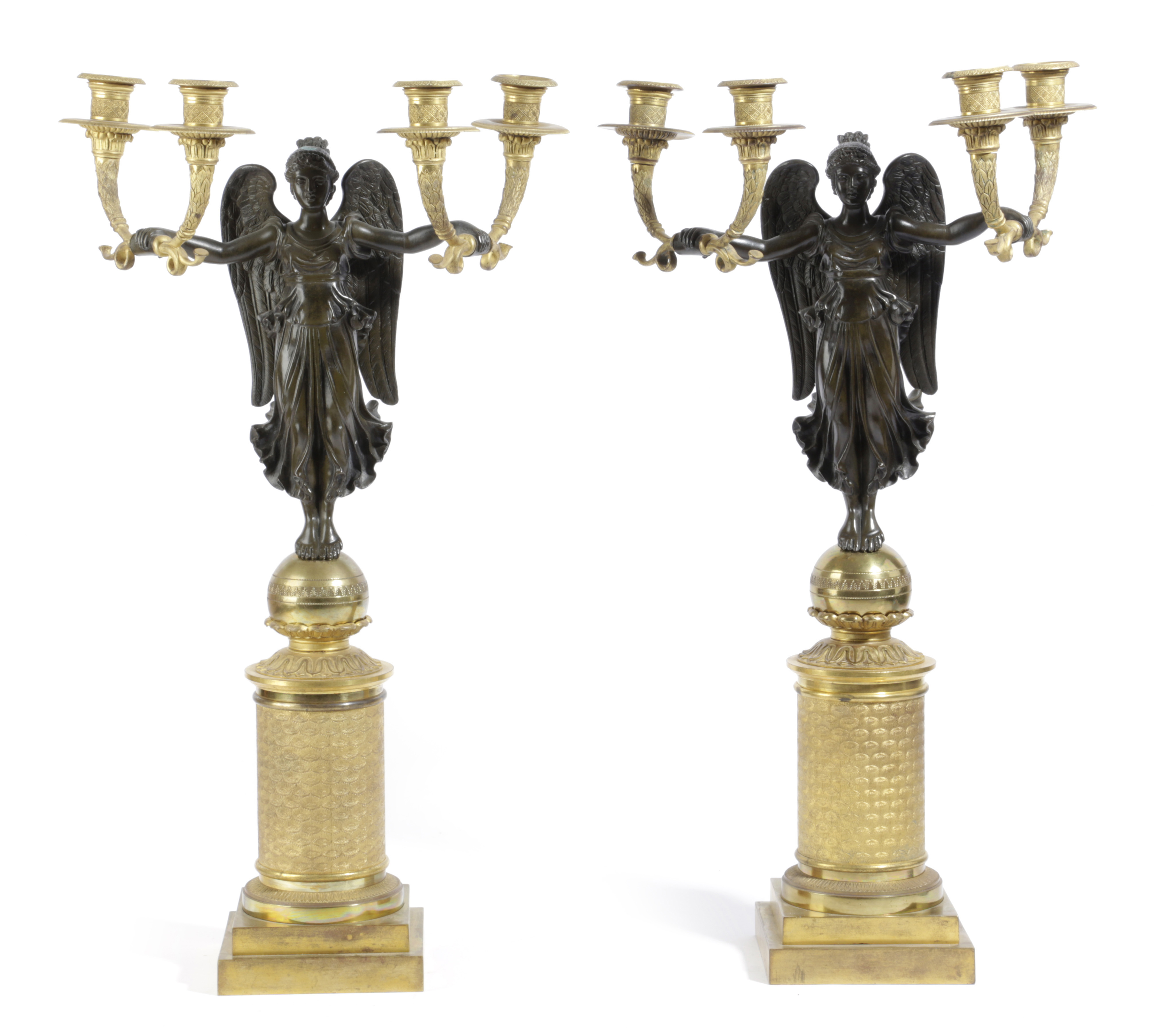 A PAIR OF FRENCH EMPIRE GILT AND PATINATED BRONZE CANDELABRA