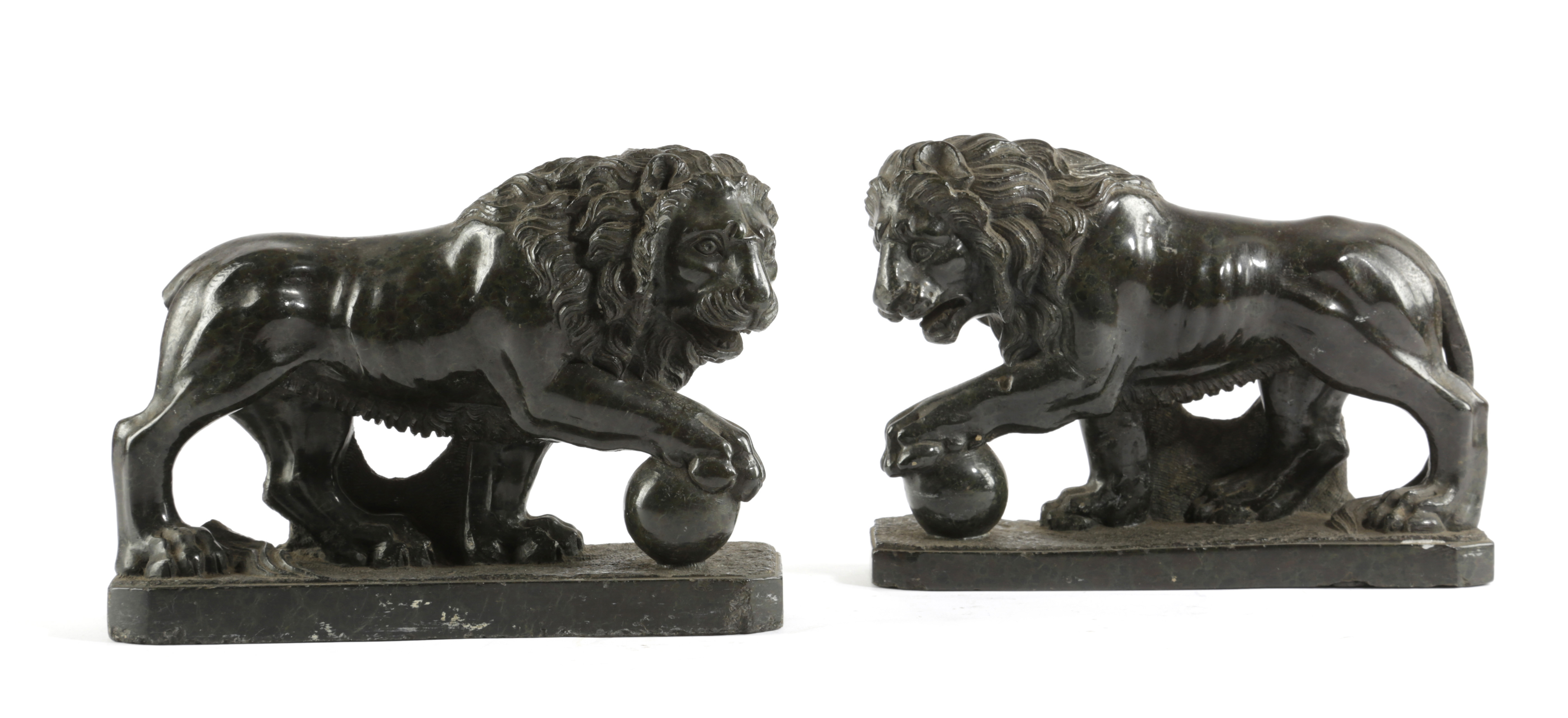 A PAIR OF ITALIAN GREEN SERPENTINE GRAND TOUR MEDICI LIONS
