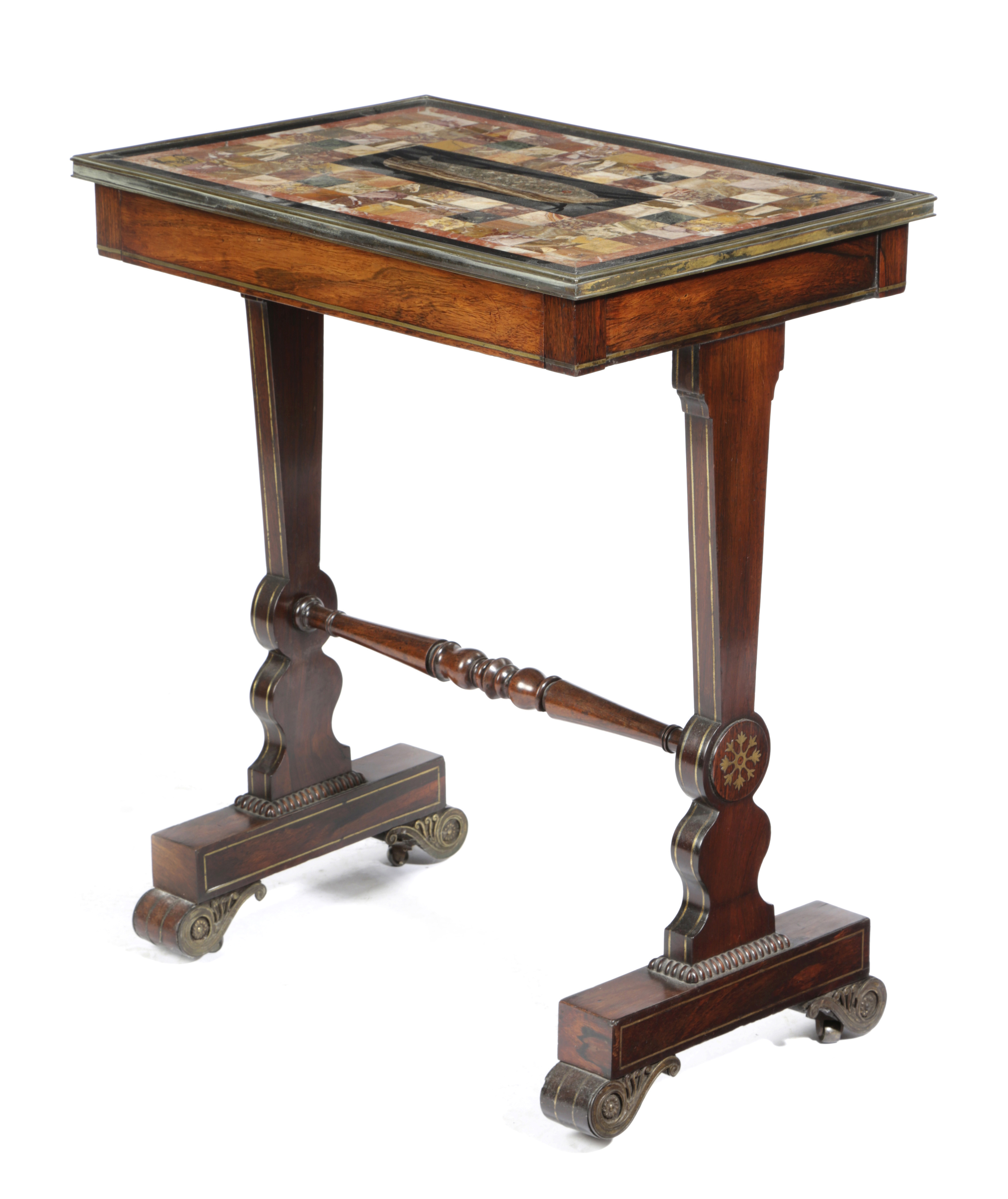 the top inlaid with a variety of marbles and alabasters including Siena, rouge griotte and verde antico, the centre with a panel depicting a fish in a bowl, the underside inscribed 'Healey, No 9 Upper Ogle Street, Mary Le Bone, London, 1819', above a frieze drawer on a rosewood and brass inlaid base with scroll feet