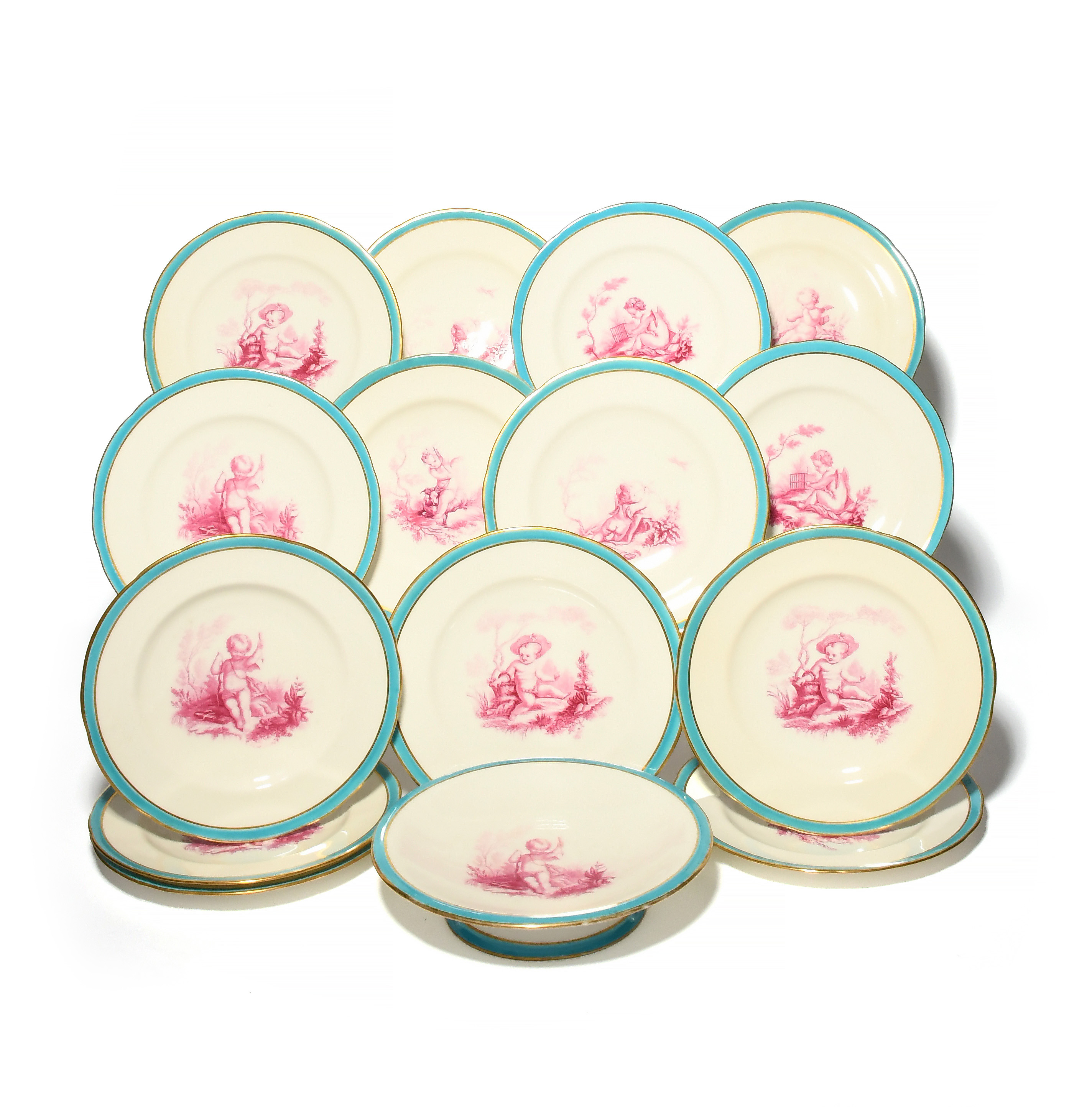 painted in the manner of Boullemier with puce monochrome scenes of putti at various pursuits, within gilt-edged turquoise borders, impressed marks and indistinct date codes, painted pattern number A6085. comprising: a tazza and 14 plates (15)