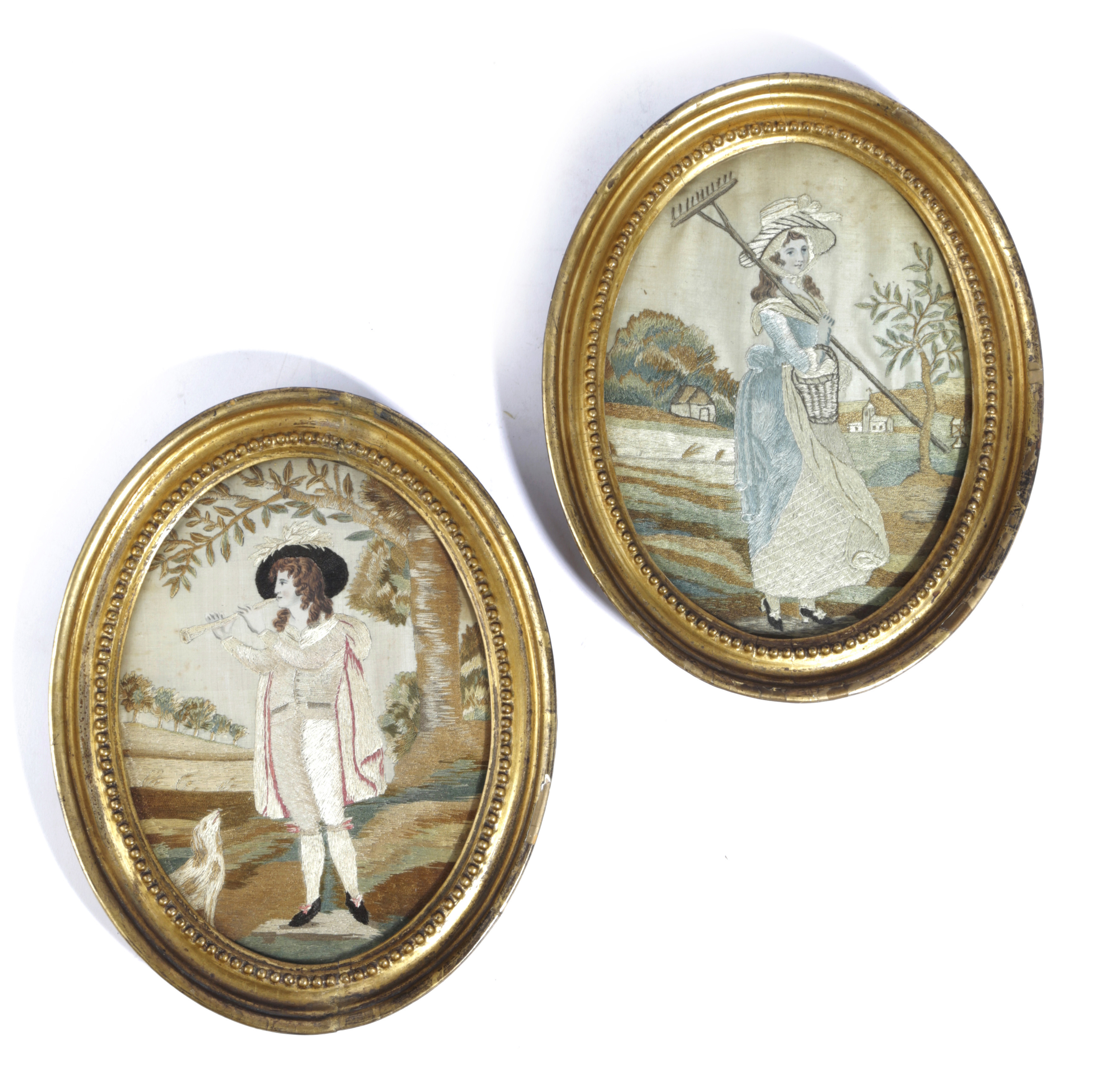 A PAIR OF GEORGE III OVAL SILKWORK AND WATERCOLOUR PICTURES