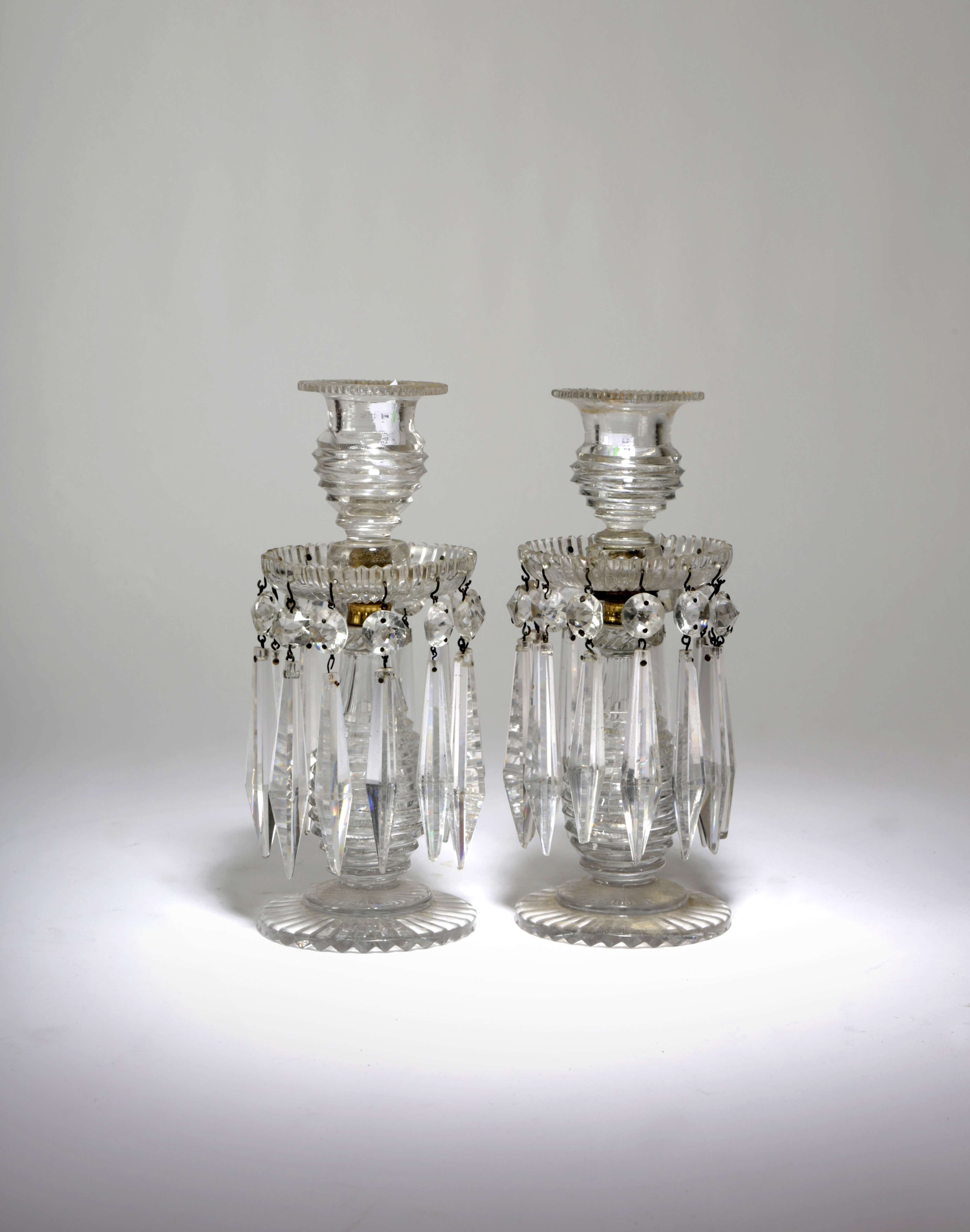 each with an urn-shaped nozzle above a drip-pan, baluster stem and circular foot, with a single tier of lustres (2)