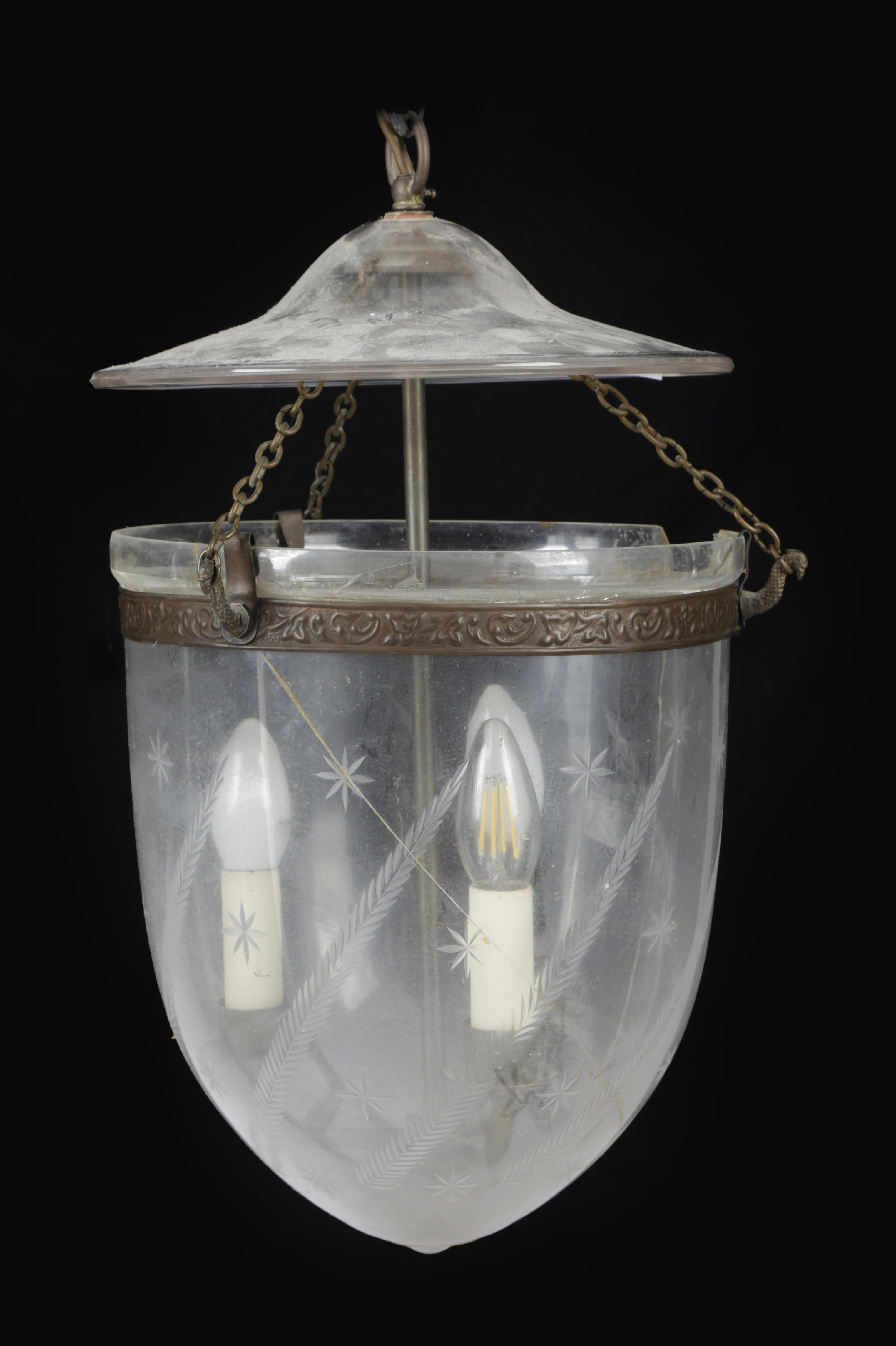 each with a 'U' shaped body suspended from chains from peacock head finials beneath a slightly domed cover (2)