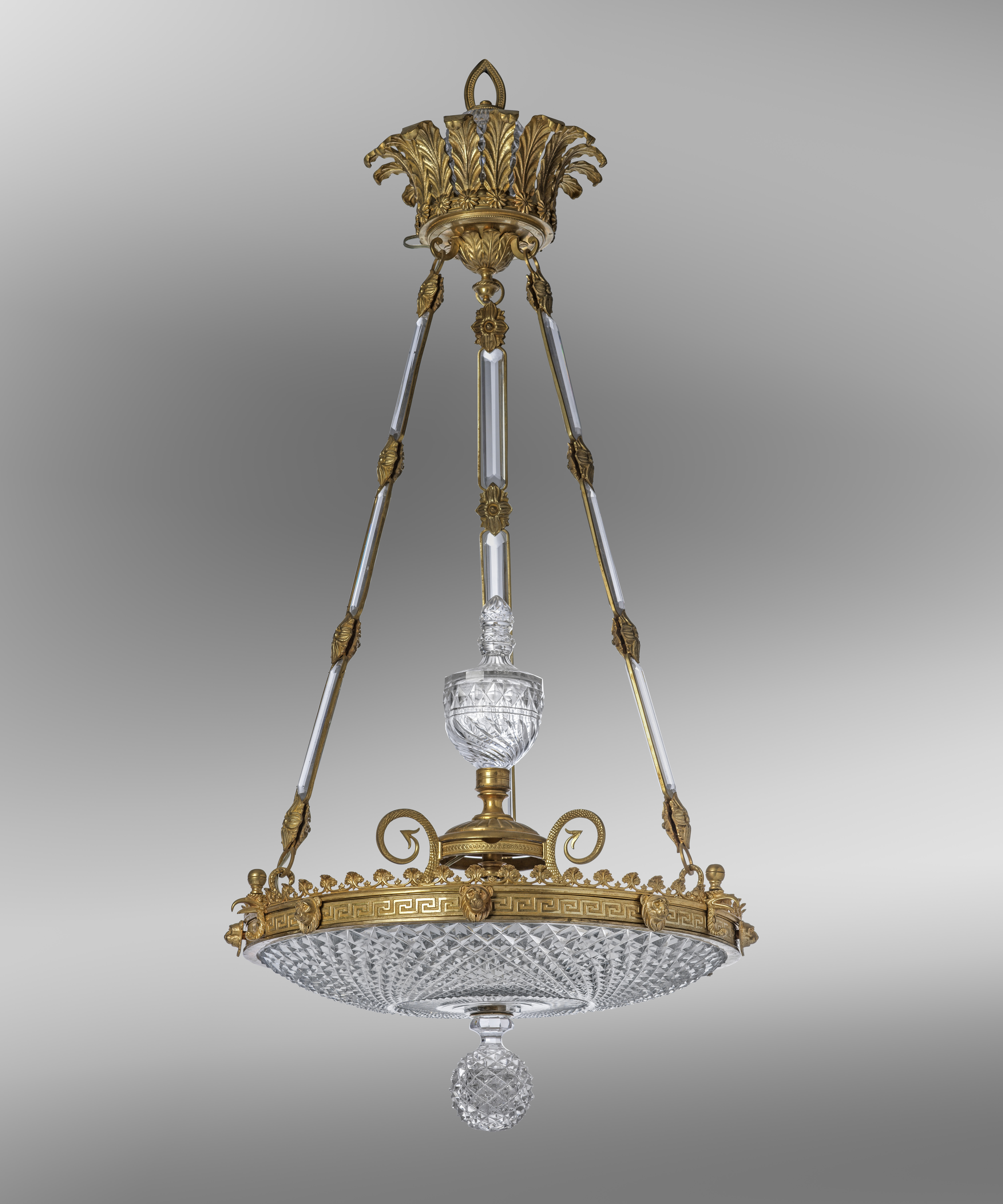 the shade with concentric bands of lozenges in a Greek key and foliate frame supported by three eagle-headed scrolling serpents around a central glass urn and ball finial, suspended from three gilt metal and glass chains and a stiff leaf and flowerhead corona with a glass orb and a ceiling rose