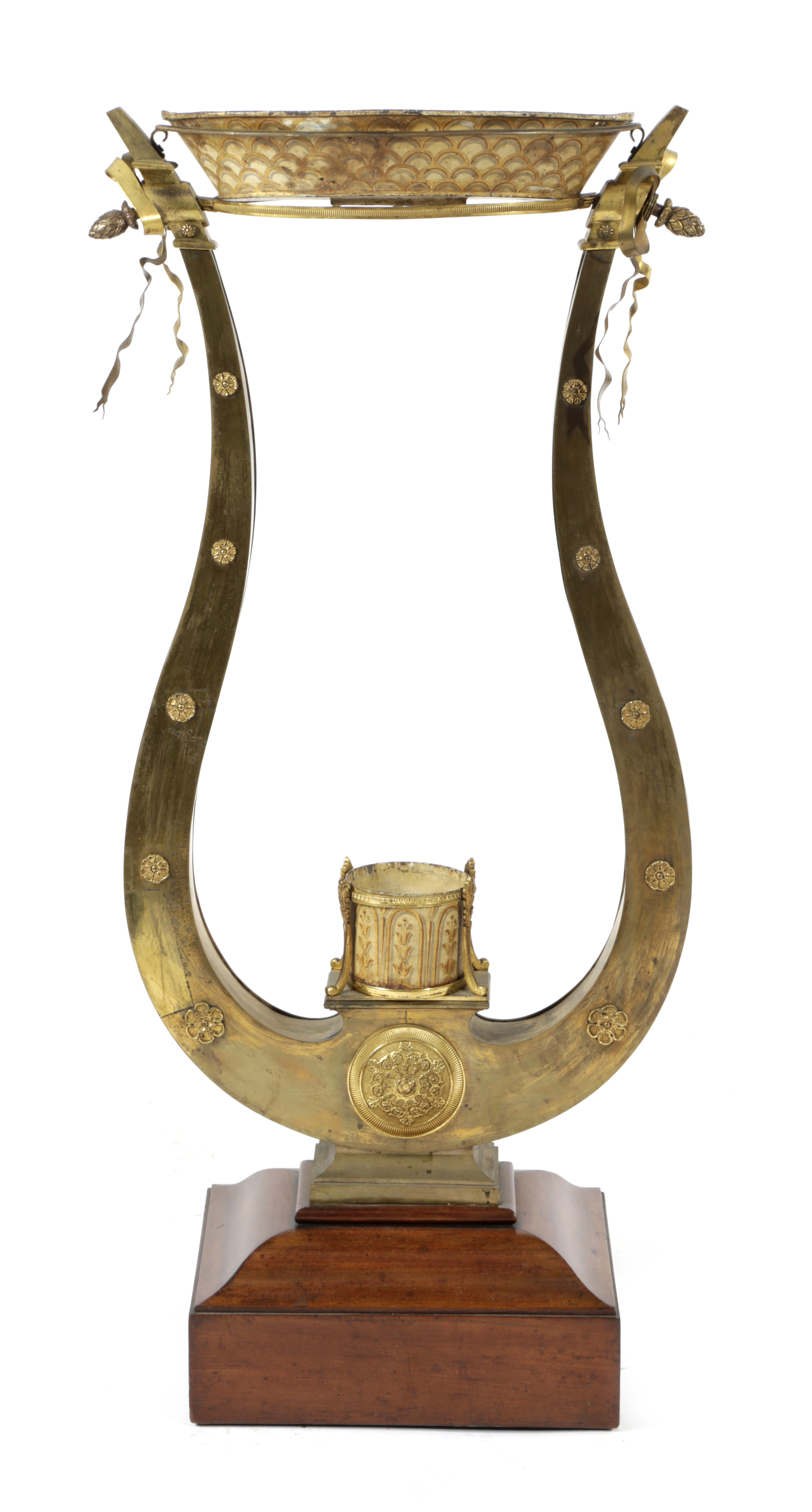 of lyre shape, with two lift-out tôle peinte liners on a rectangular plinth base