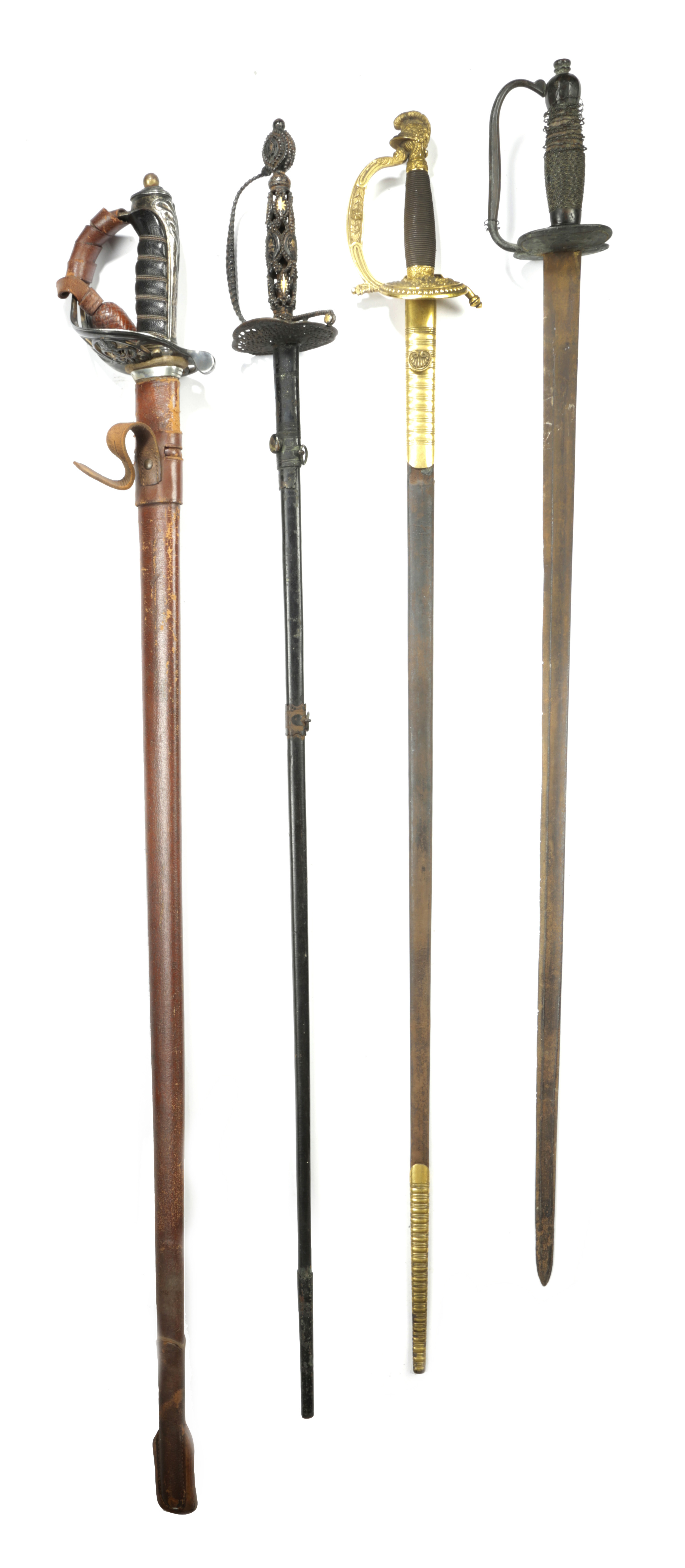 with a 32in hollow triangular-section blade with pierced and engraved copper shell guard, steel openwork grip with gilded details to small panels set in a beaded framework, steel mounted leather scabbard; together with a Victorian court sword, lenticular section blade 31 in. with etched decoration including VR cypher and the retailer's name 'STARKEY 5 OLD BOND STREET LONDON', gilt-brass hilt with helmet pommel and shell guard with writhing beasts in relief within a beaded border, gilt-brass mounted leather scabbard; a Georgian Infantry officer's spadroon with brass hilt of 1796 type and an Indian made sword of Infantry type with 'gothic' hilt, the latter with scabbard and sword bag (4)