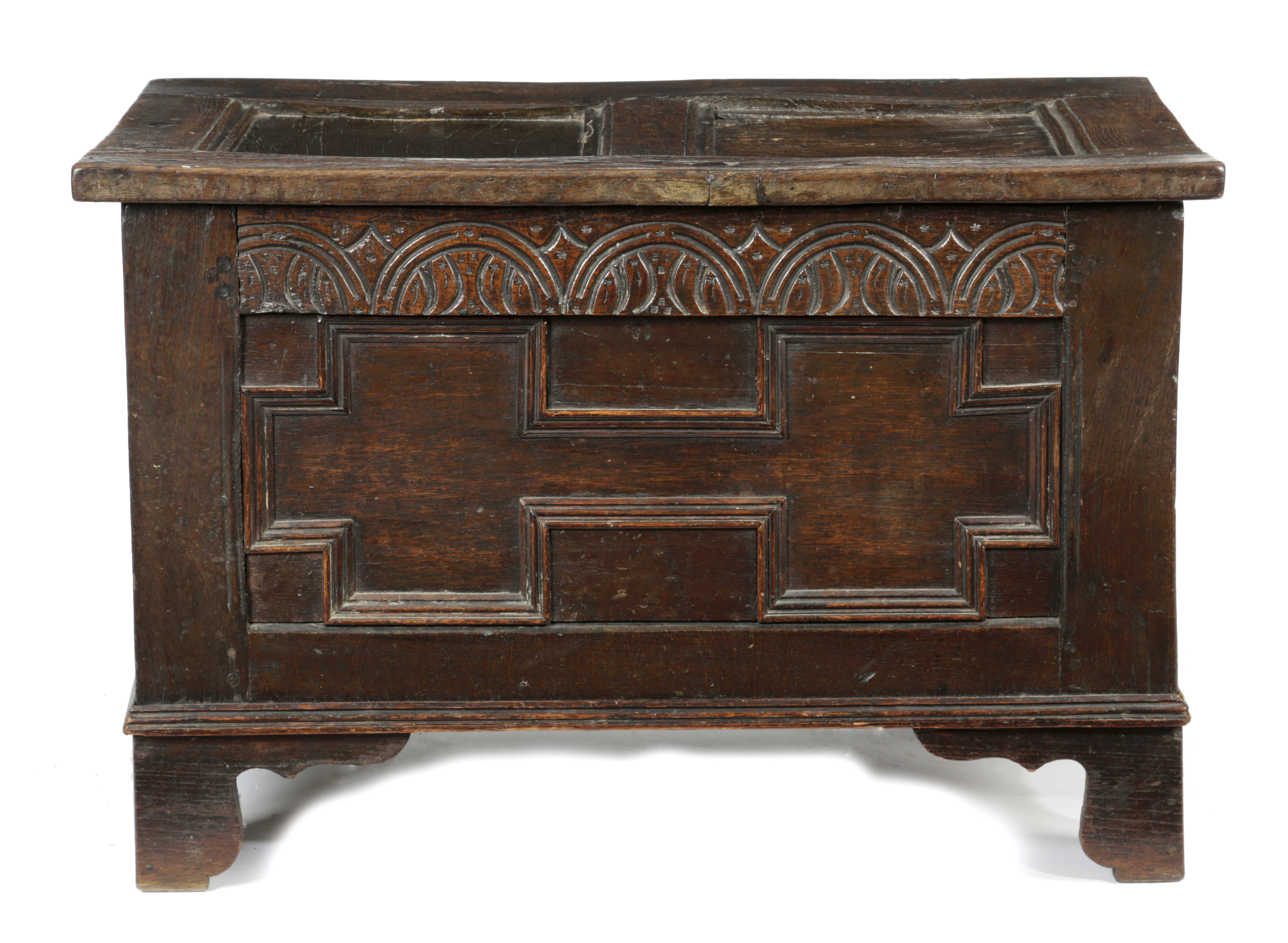 the twin panelled top above a carved lunette frieze and mitre moulded front