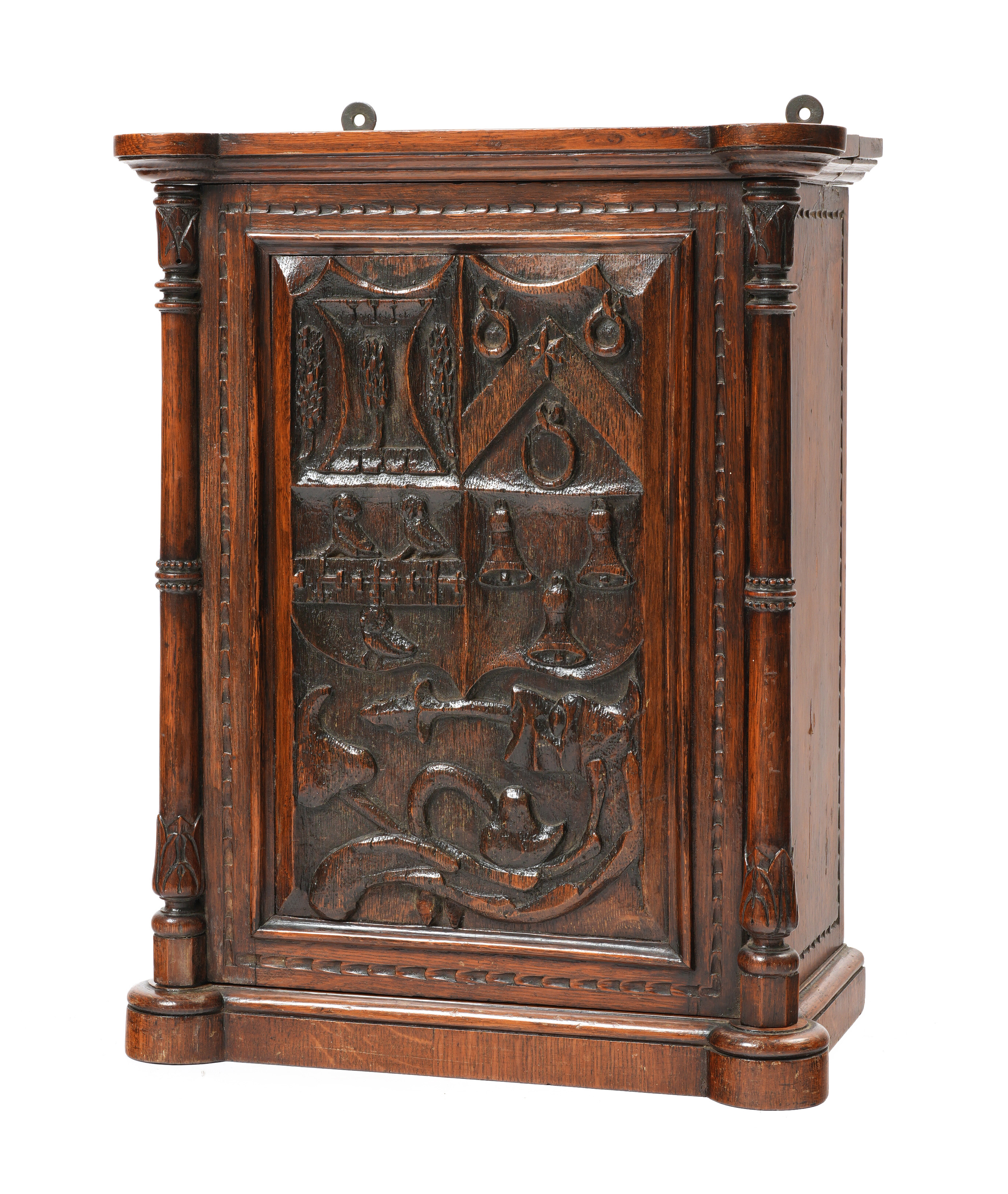 carved with the quartered arms for the Frere (Fryer) family of Water Eaton Manor, Cherwell, Oxfordshire, above scrolling foliage and a stylised dragon head, mounted in the door of a Victorian oak mural cabinet with a nulled frame flanked by carved and turned columns and enclosing five drawers with lion head, lozenge and lunette decoration
