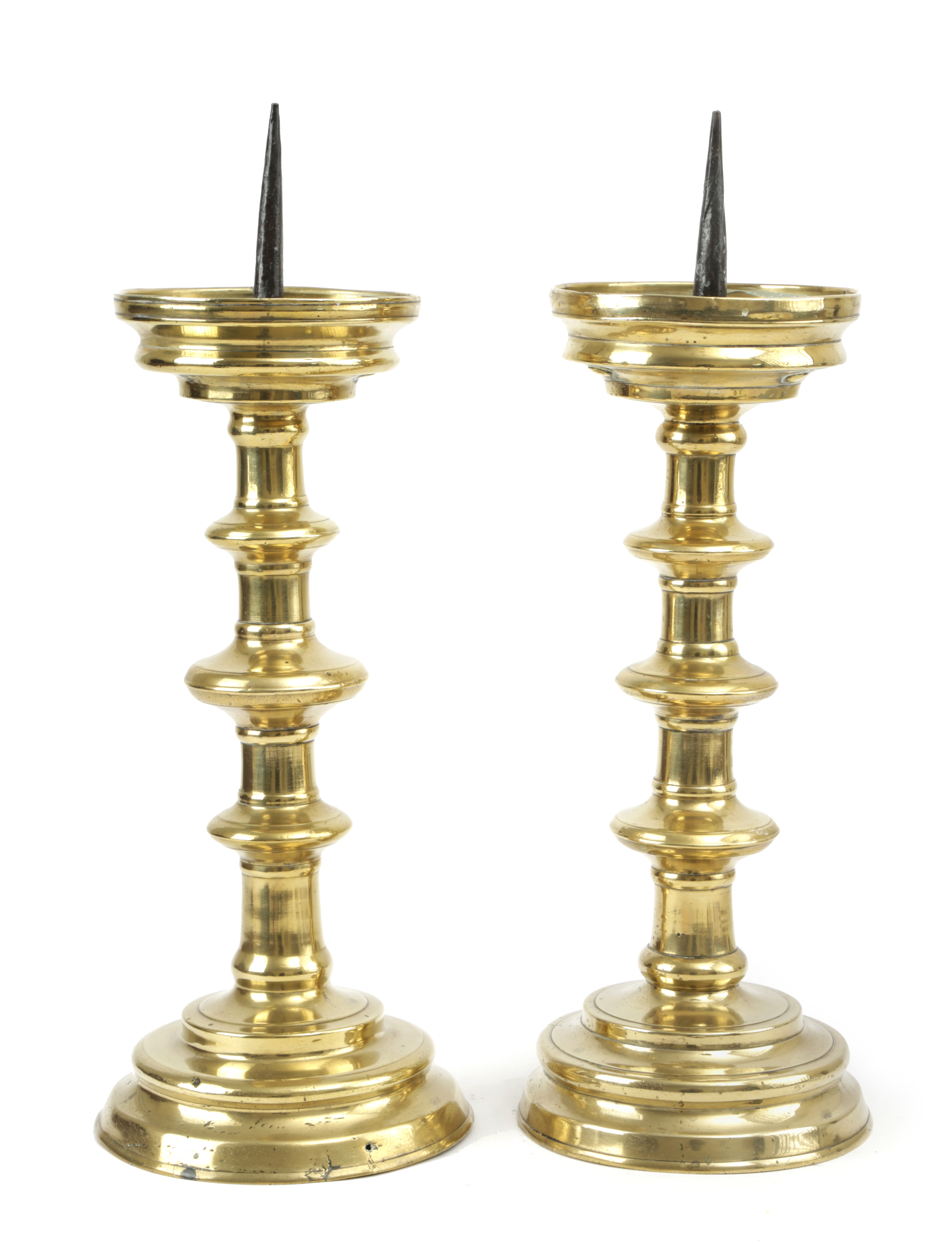 A NEAR PAIR OF GERMAN BRASS PRICKET CANDLESTICKS