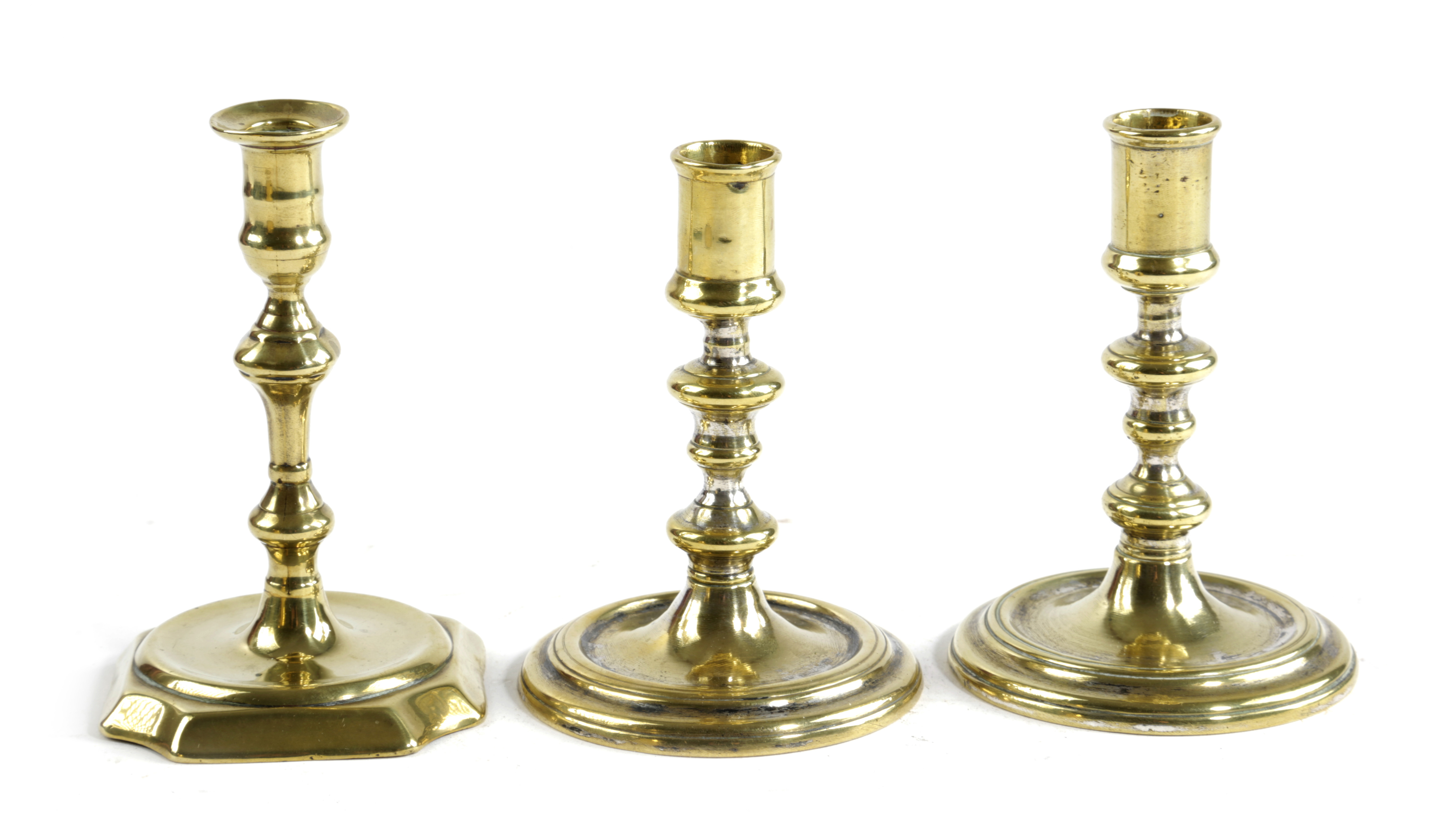 each with a cylindrical socket above a knopped stem and banded, spreading foot, with traces of silvering, together with another, c.1730, with a square inverted baluster stem and cut corner foot (3)