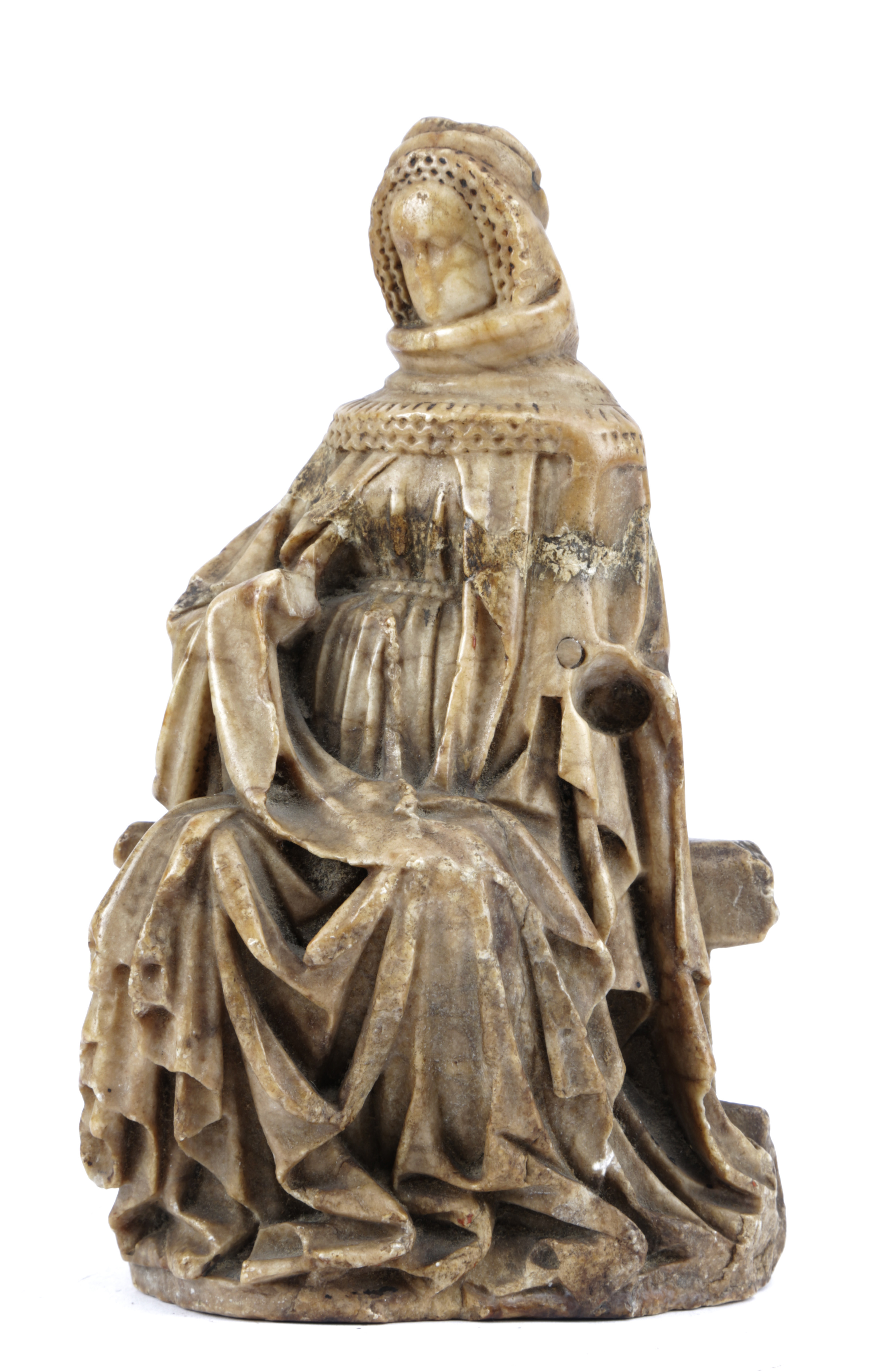 possibly depicting a Queen or the Virgin Mary, carved seated on a bench and wearing a French hood, broad lace collar and a full dress, losses