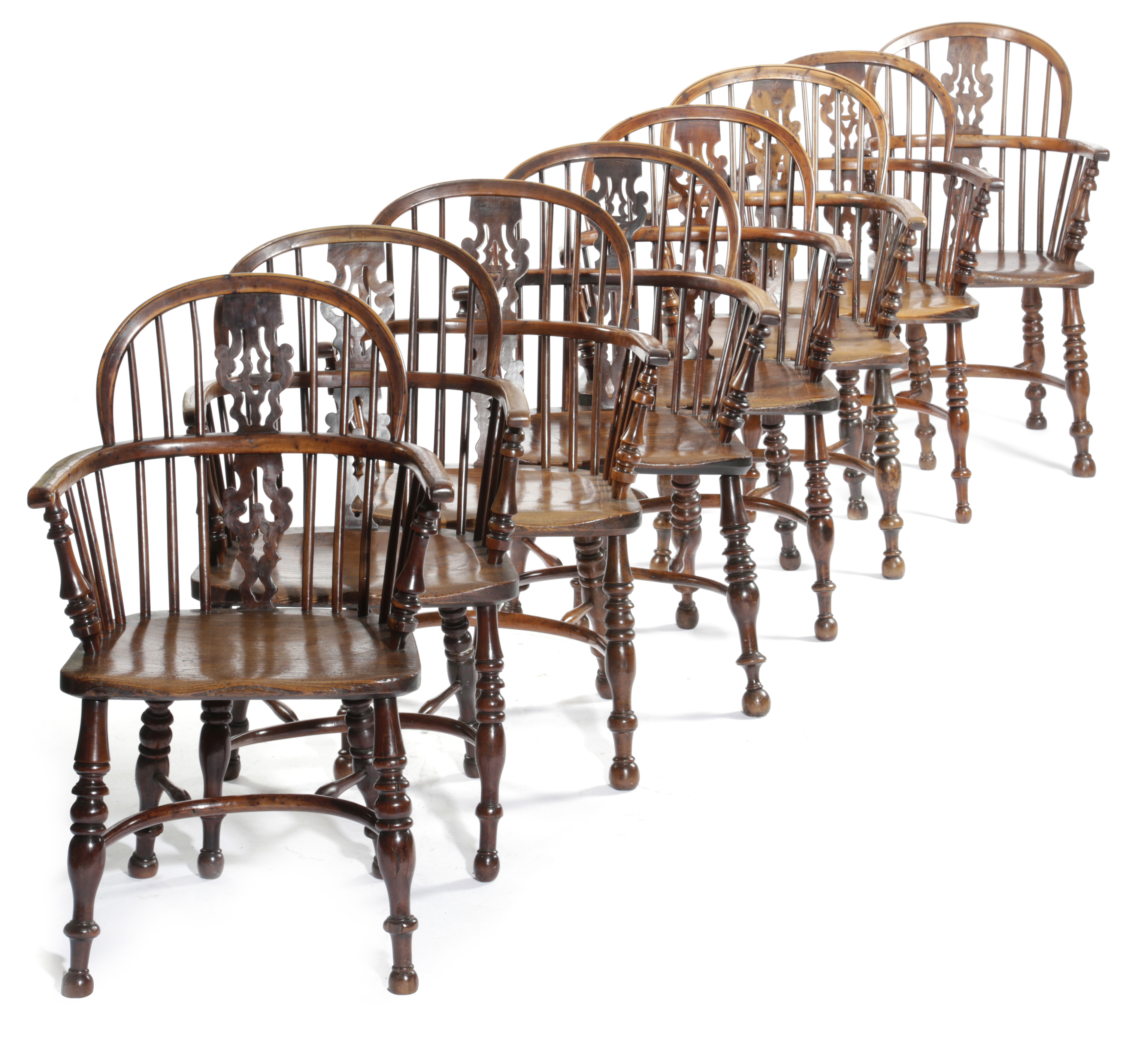 A MATCHED SET OF EIGHT WILLIAM IV YEW AND ELM WINDSOR ARMCHAIRS