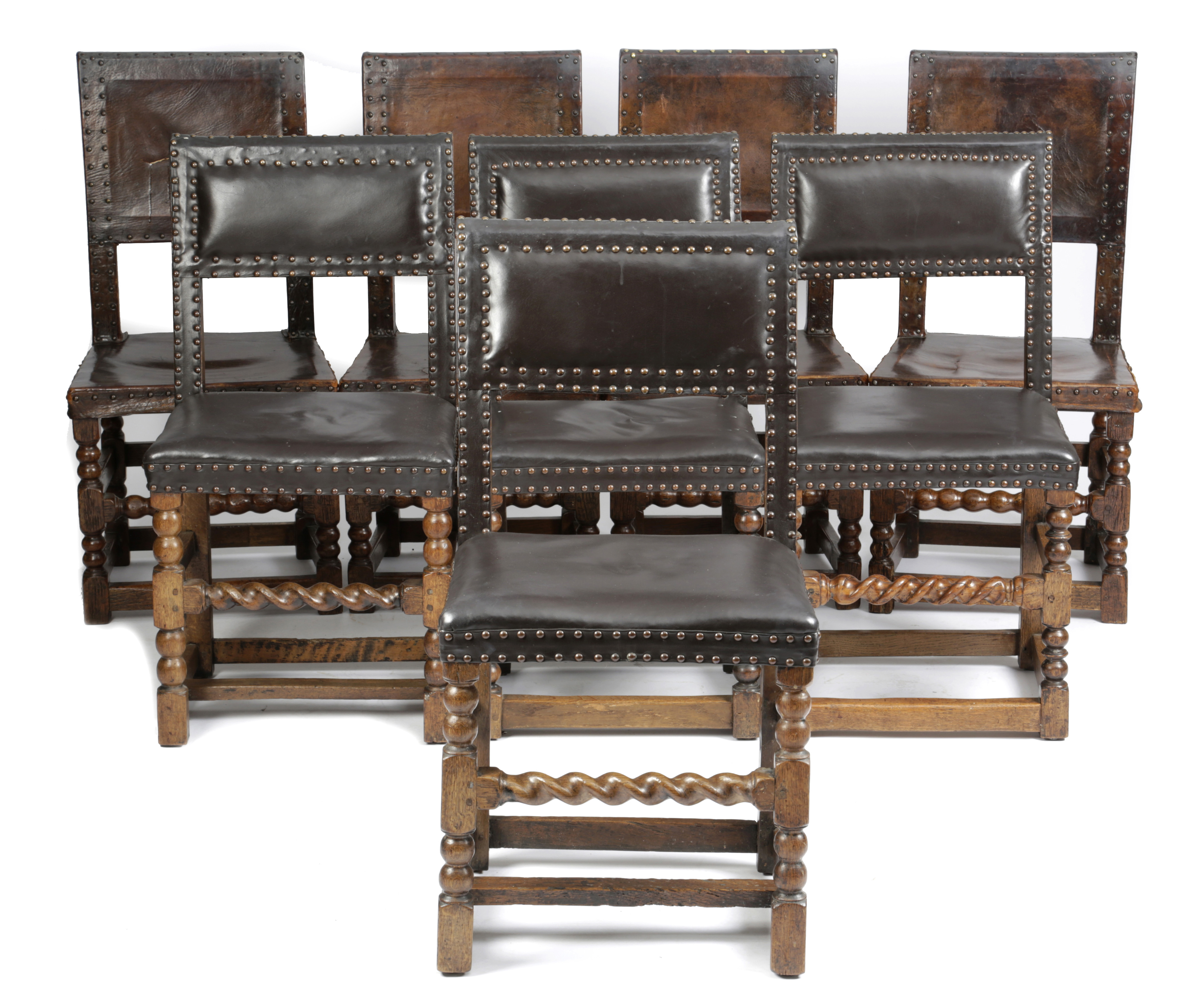 each with a leather back and seat with brass studded decoration, comprising: a set of four with bobbin turned decoration and two pairs with spiral twist front rails (8)