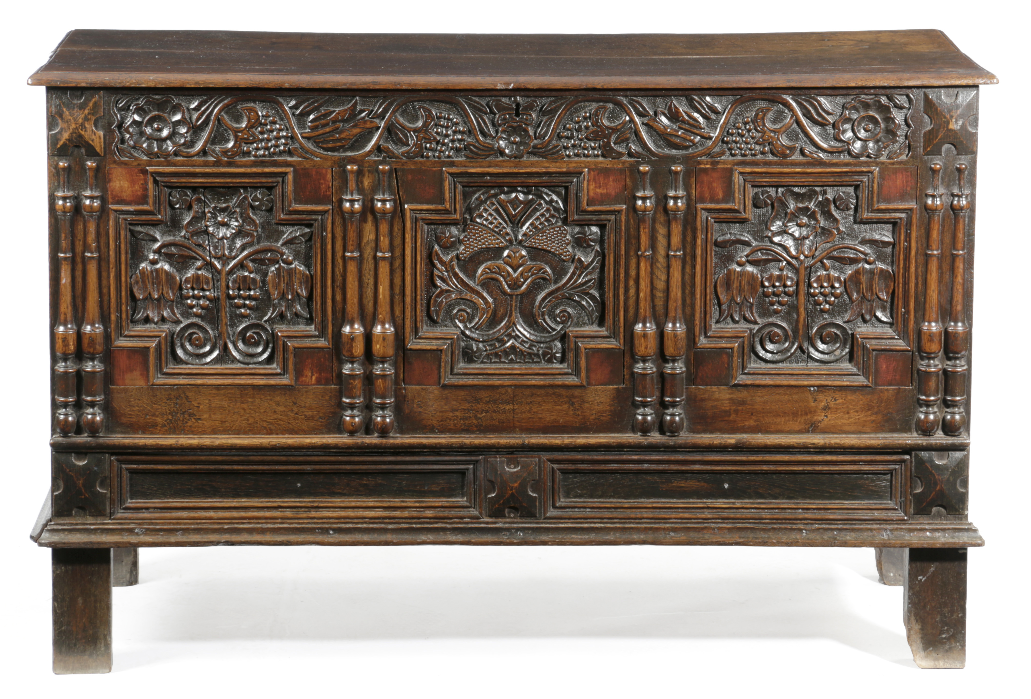 the front carved with a rosette and grapevine frieze, above triple conforming panels, flanked by split baluster mouldings, above a base drawer