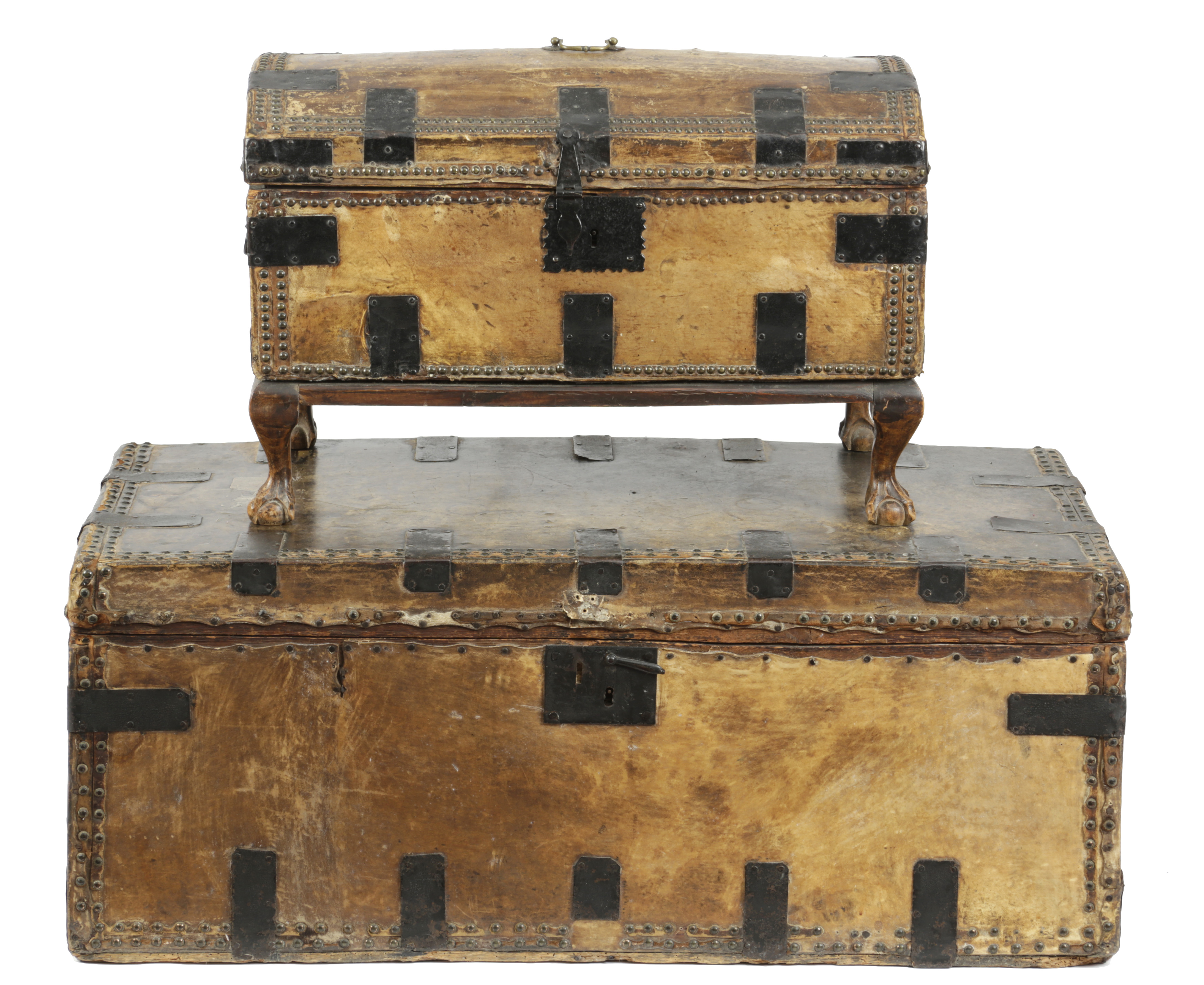 with studded decoration, iron mounts and side carrying handles, together with a small domed example on a later stand (2)