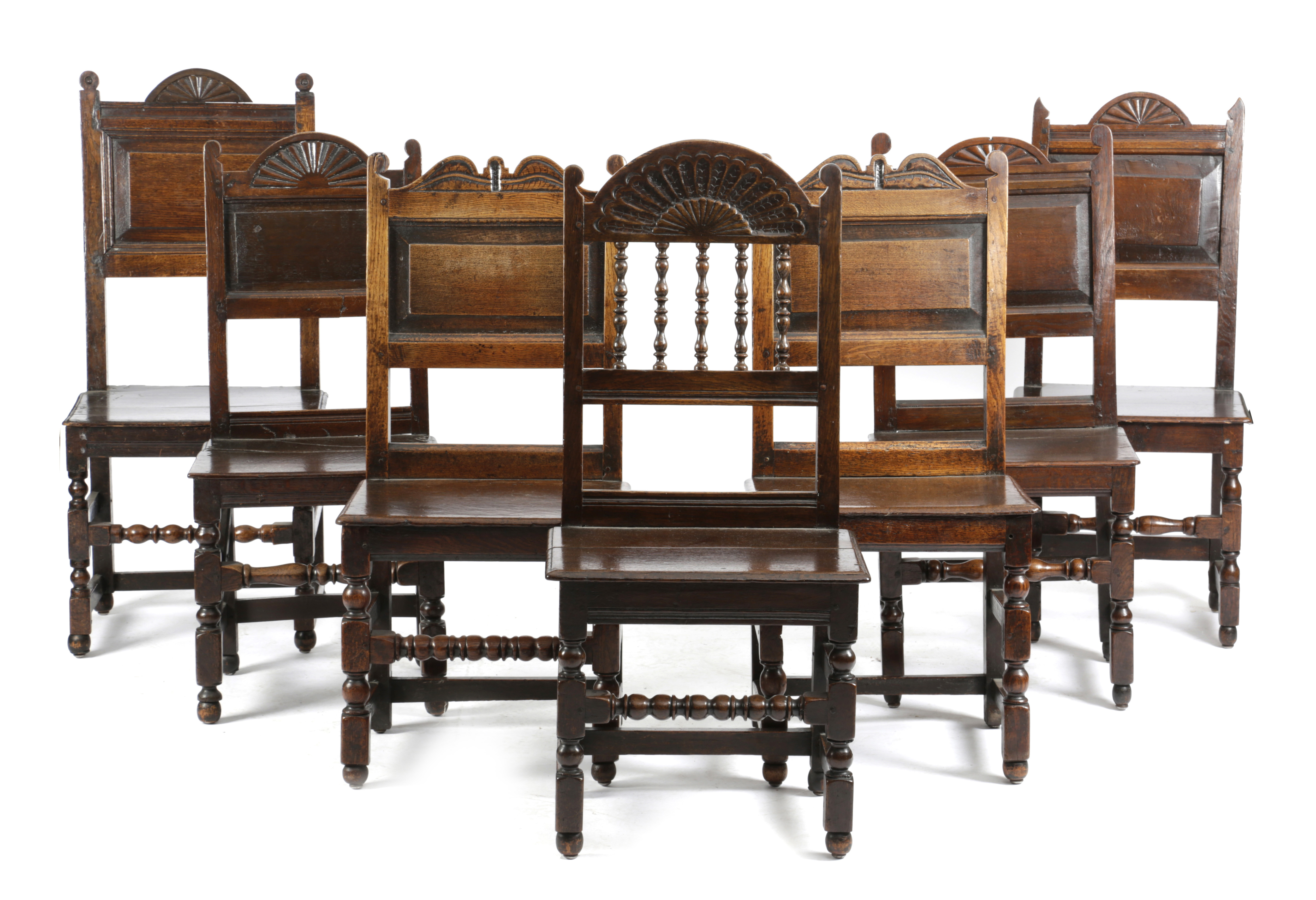 each with a 'letterbox' back, five with a fan top rail, one with a spindle back and a pair with a scroll surmount (7)