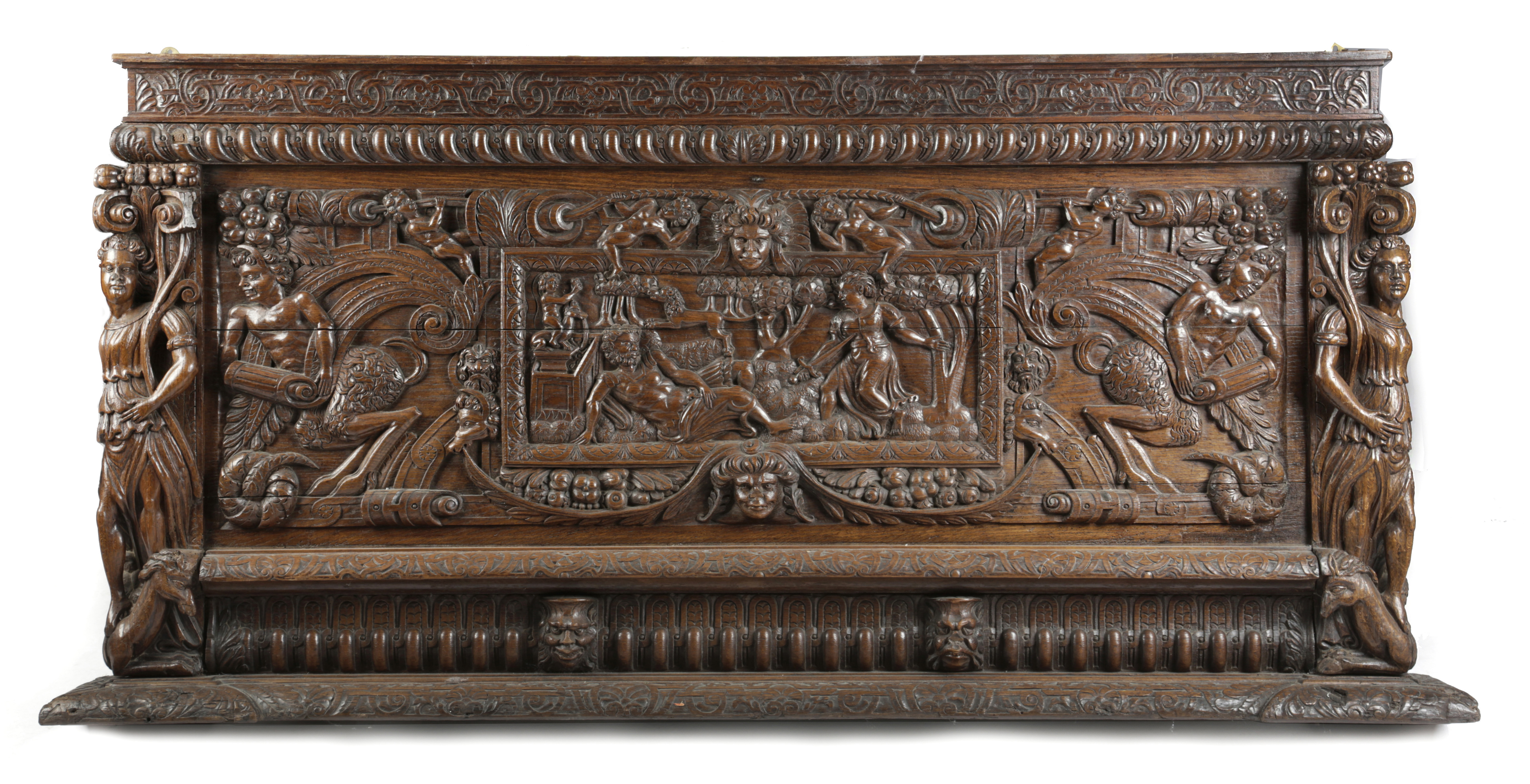 with a strapwork frieze above a central tableau carved with the mythical story of Pyramis and Thisbi and flanked by cherubs and satyrs, the corners carved with caryatids standing on a mythical sea creature