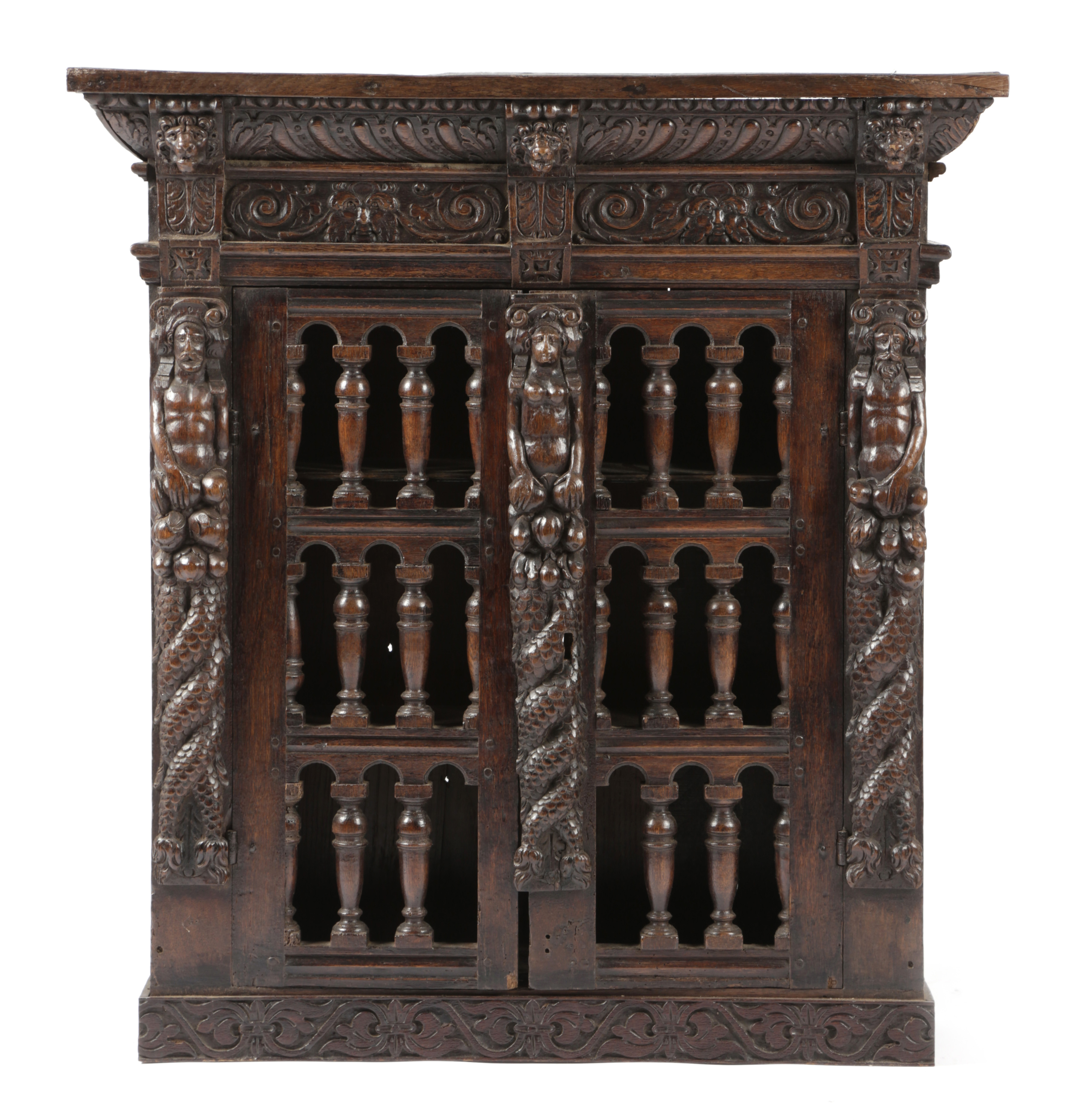 the frieze with gadrooned and rinceau decoration and carved with lion's masks above a pair of turned spindle panelled doors flanked by figural caryatids