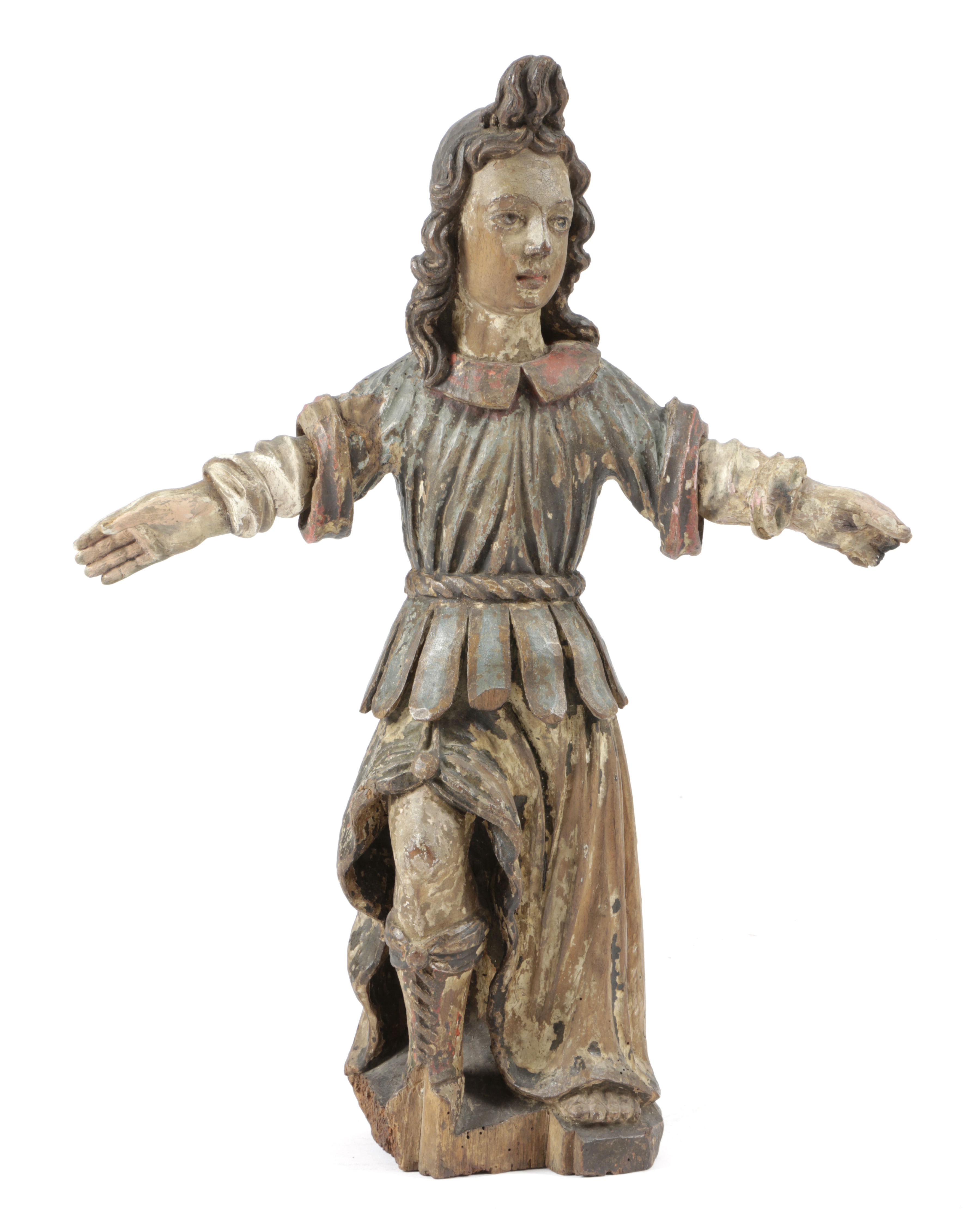 A CARVED WOOD AND POLYCHROME DECORATED FIGURE OF A SAINT