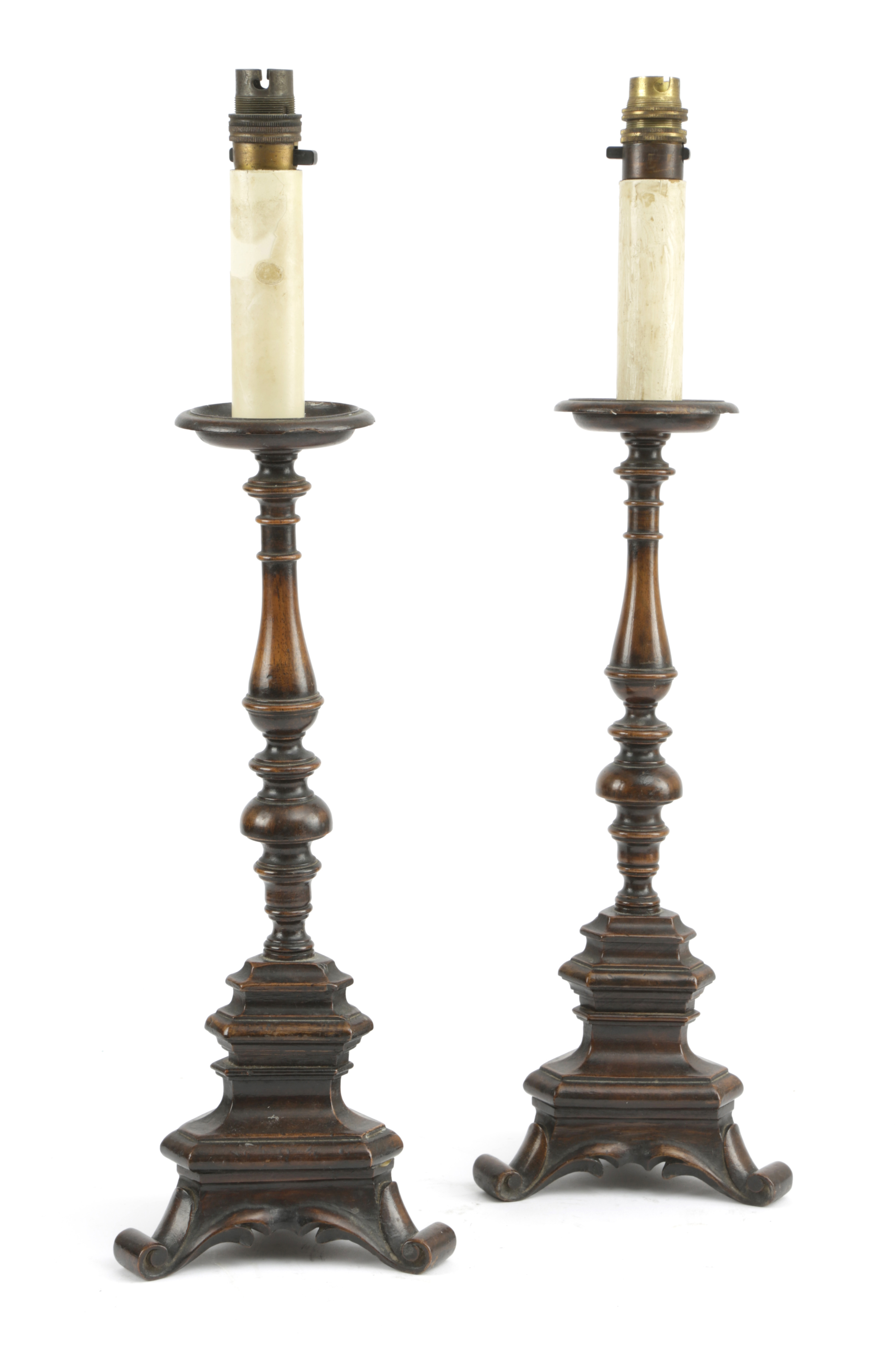 A PAIR OF ITALIAN WALNUT ALTAR STYLE CANDLESTICK TABLE LAMPS