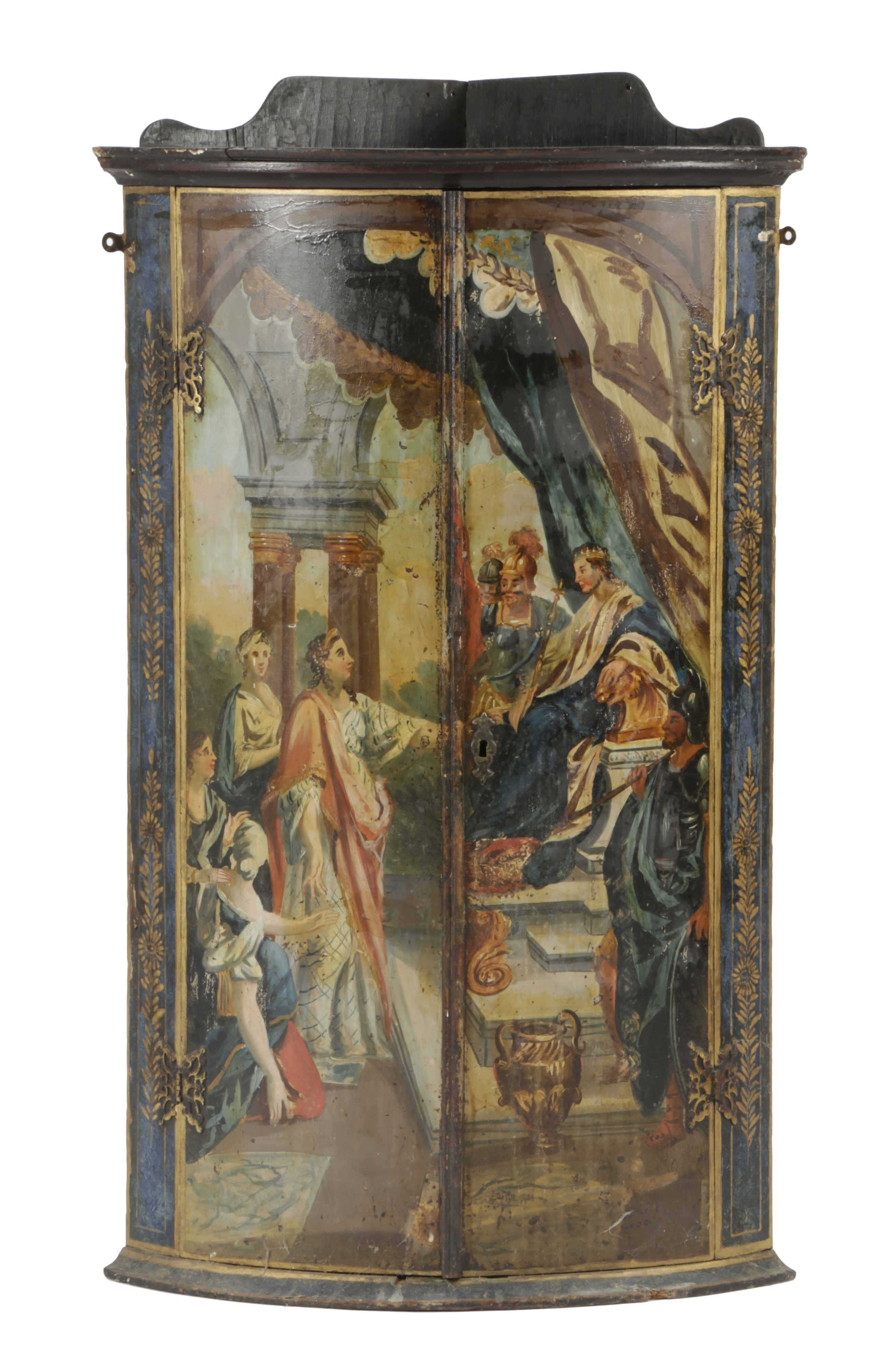 A DUTCH PAINTED BOWFRONT HANGING CORNER CUPBOARD