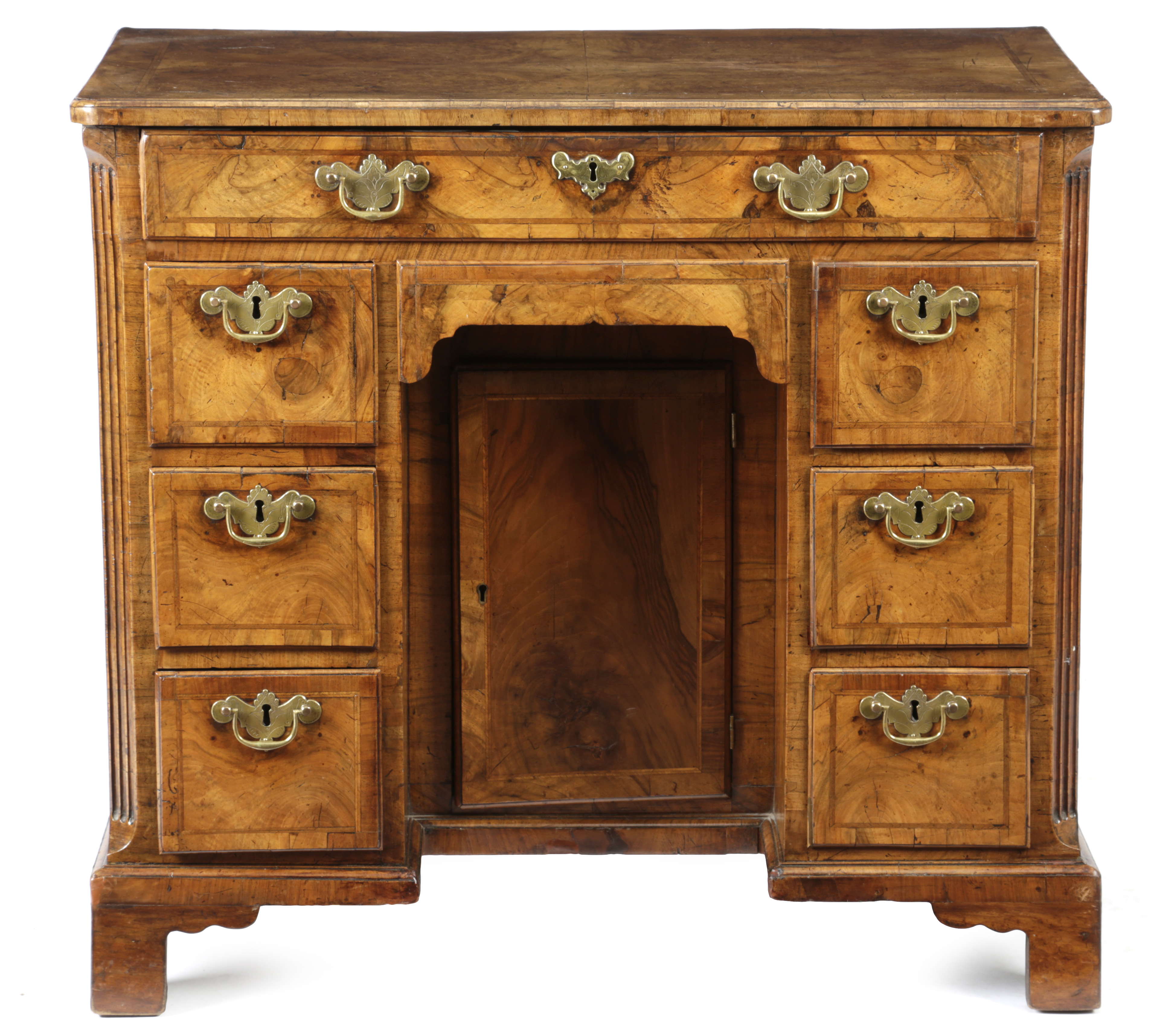 with feather and crossbanding, the quarter veneered top with a caddy moulded edge above an arrangement of eight walnut lined drawers around a cupboard flanked by fluted angles