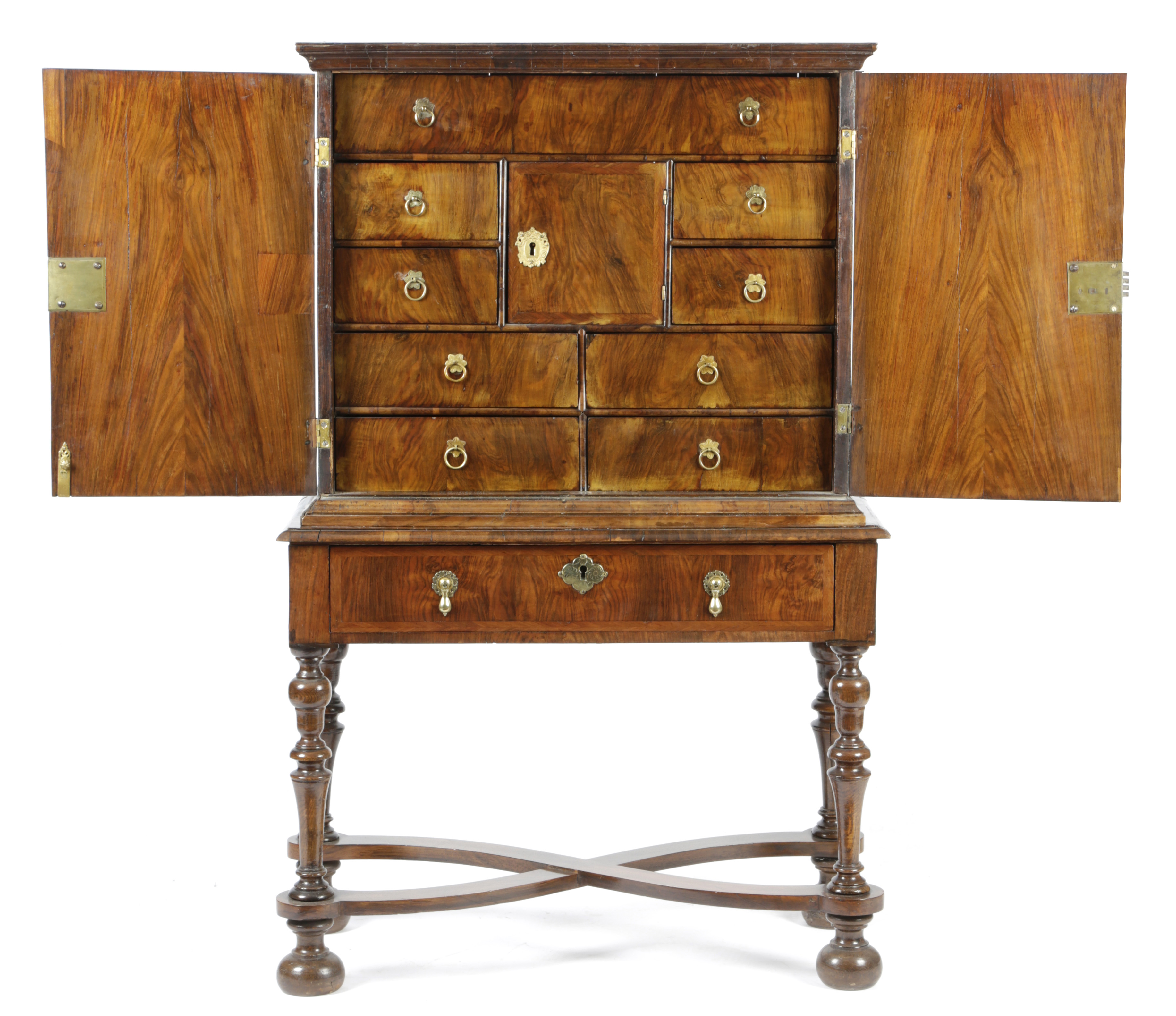 with a pair of cross and feather banded doors enclosing an arrangement of nine drawers around a central cupboard, the stand with a frieze drawer