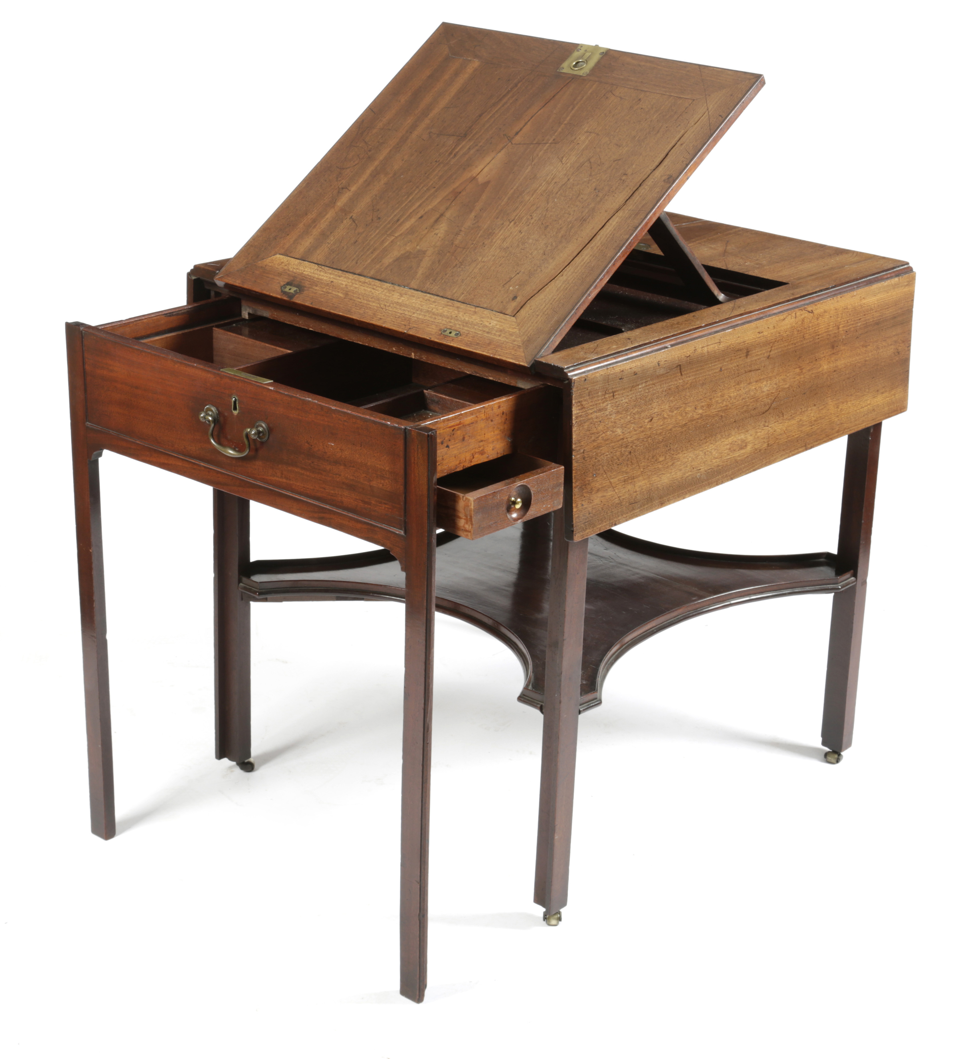 the drop-leaf top with a hinged slope on a ratchet with a removeable rest, the frieze drawer revealing hinged compartments, divisions, pen and ink drawer and candleslides, with a shaped undertier and brass roller castors