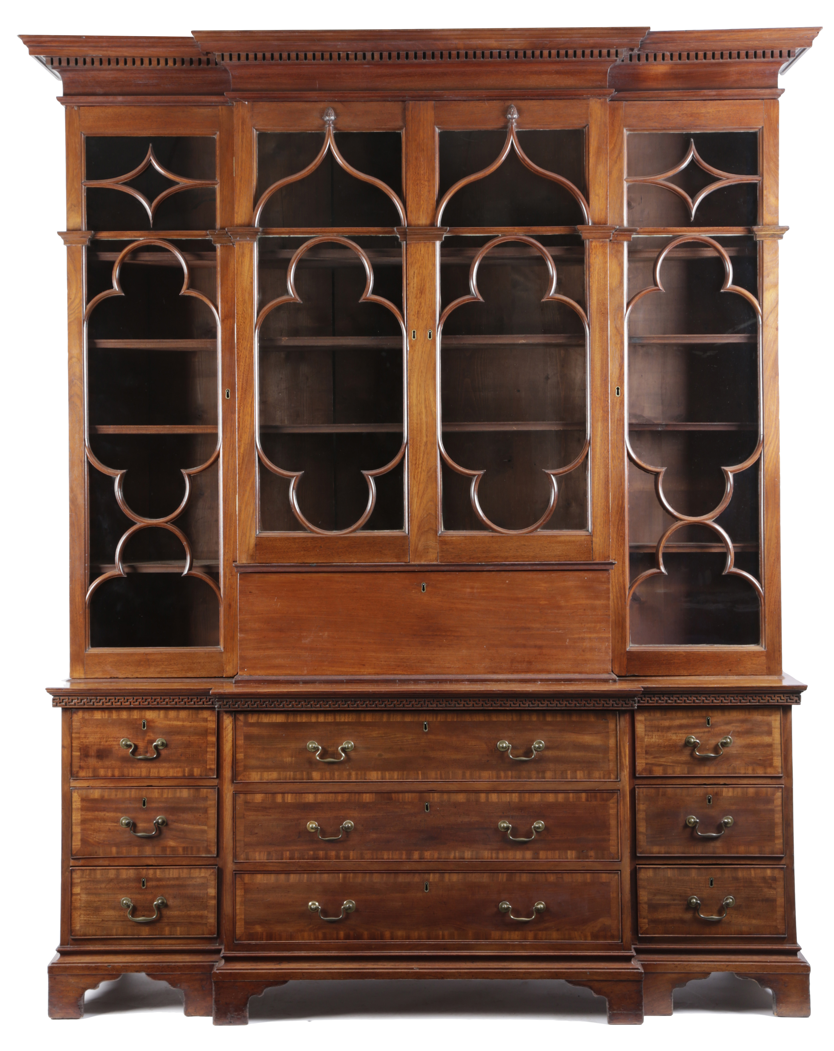 This bookcase has a number of unusual features that suggest that it may have been designed by an architect rather than a furniture designer. These include the laminated glazing bars that are applied to the glass rather than having the glass set into rebates, the single central cupboard stile rather than it being a pair of stiles, the overly engineered door bolts, the fall front not having any supporting brackets, the un-graduated central run of drawers, the inclusion of a folio cupboard and the moulding across the upper section that limit how wide the doors can open. A final feature of note are the finials applied to the door frames above the central ogee glazing bars which are comparable to those applied to a library bookcase illustrated in Thomas Chippendale's 'The Gentleman and Cabinet Maker's Director', 3rd Edition, 1762, plate XCVIII.
