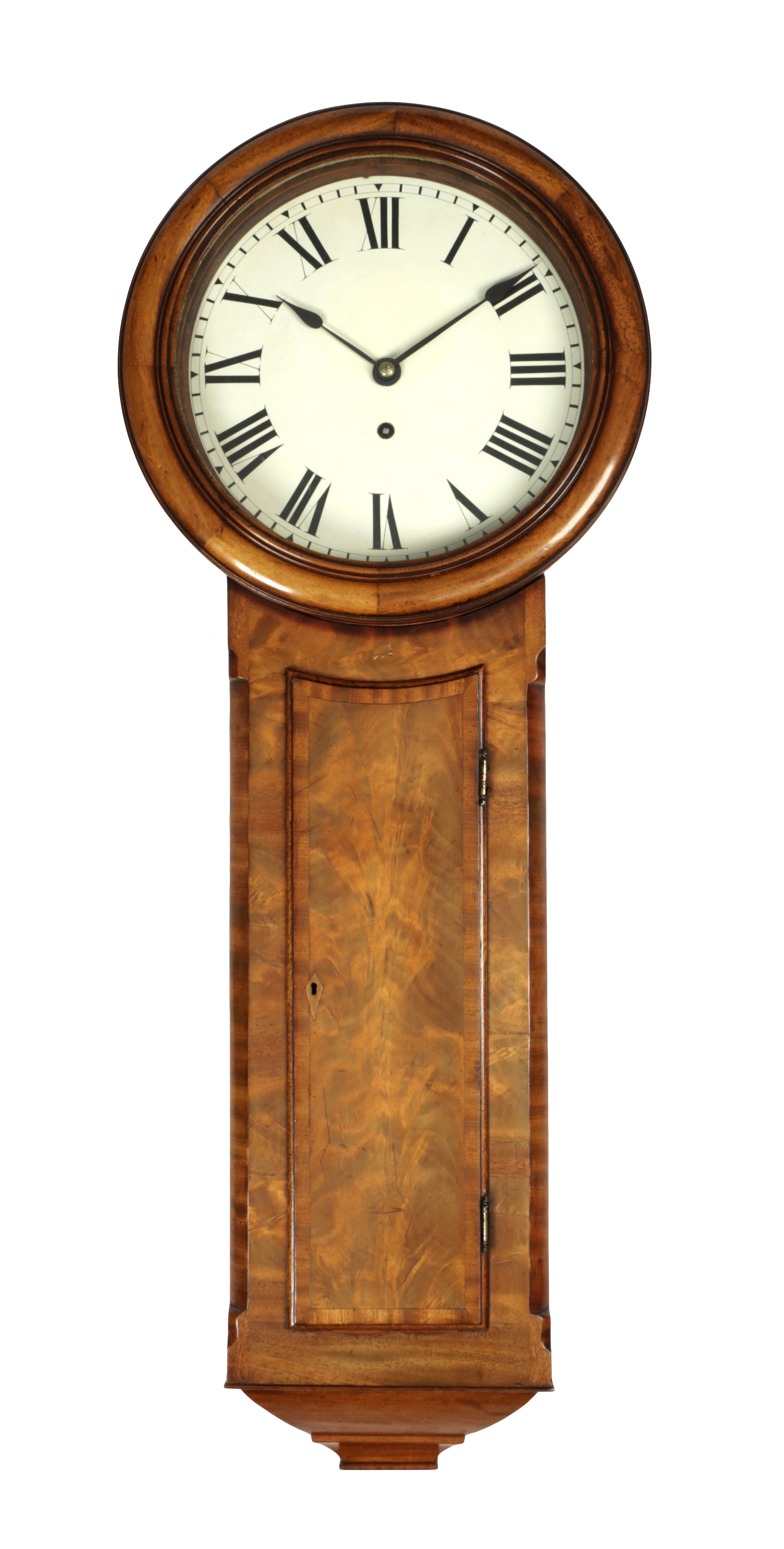 the brass eight day movement with tapering plates on a 13 1/2 inch enamelled dial with black Roman numerals, above a shaped rectangular, crossbanded door, with a weight and pendulum