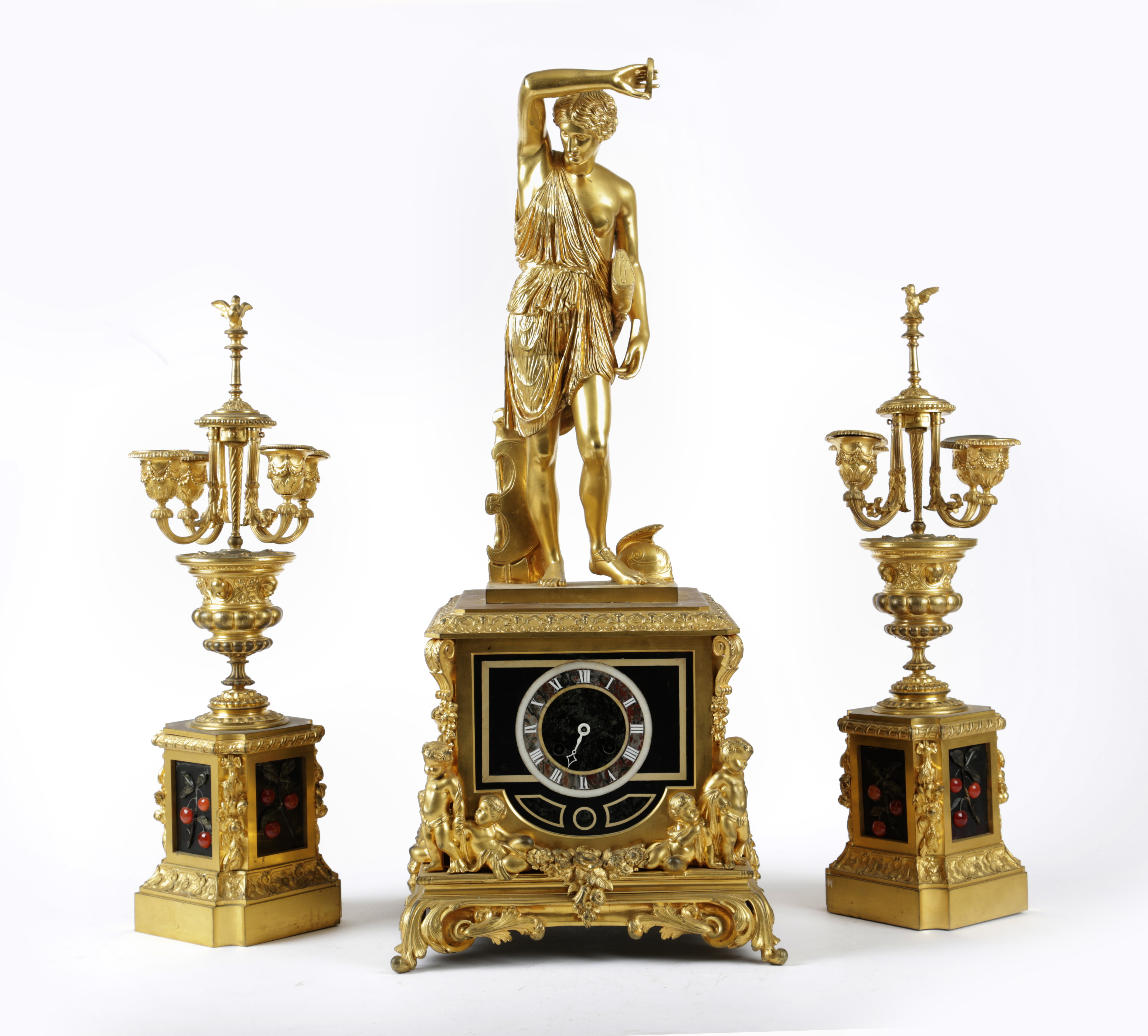 the brass drum movement with an outside countwheel originally striking on a bell, the backplate stamped with a pastille, the circular dial with Roman numerals, the case with hardstone panels of cherries and surmounted by a figure of Diana of Gabii, possibly by Barbedienne, above cherub figures, flowers and fruits, together with a pair of matching four light candelabra (3)
