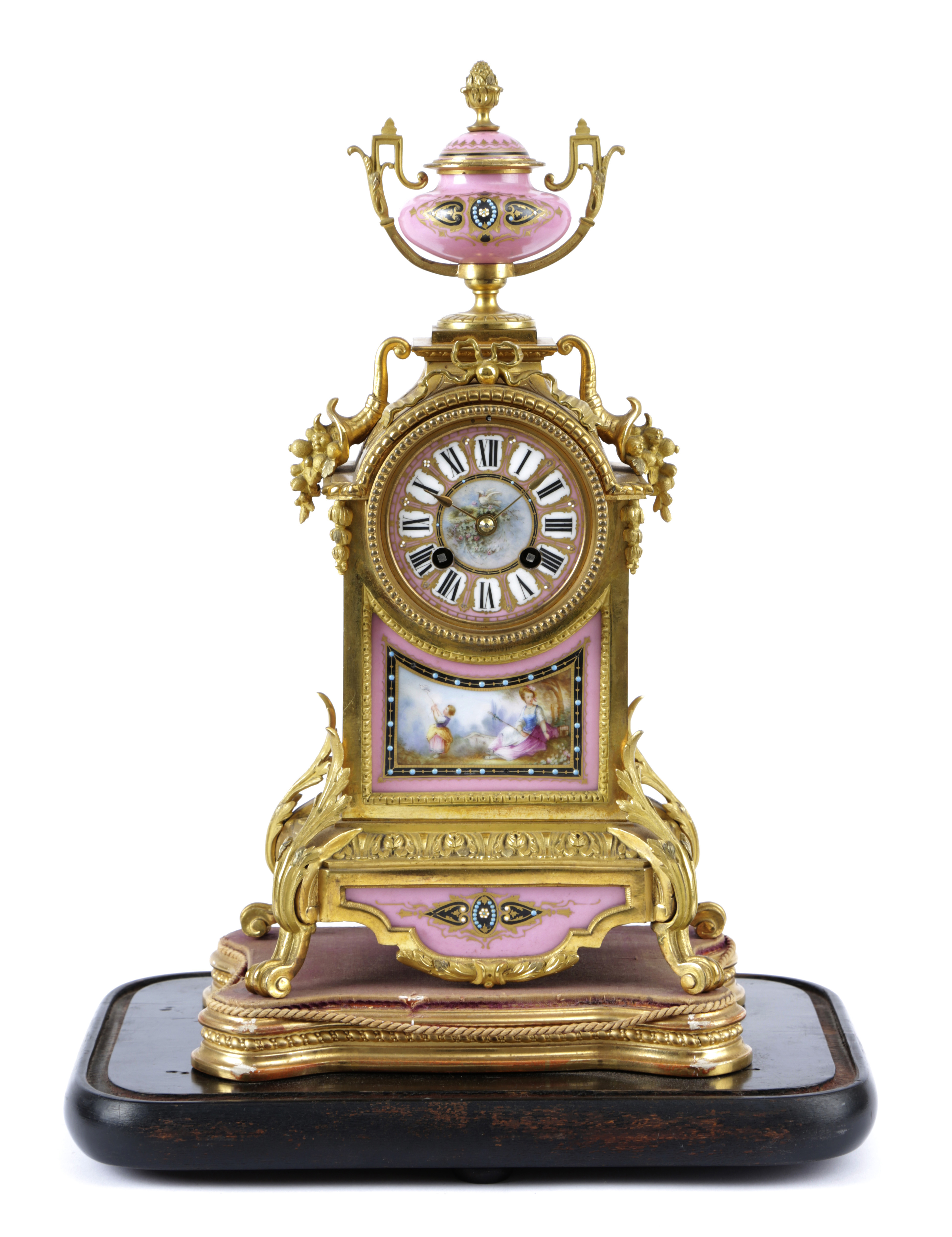 the brass eight day movement striking on a bell and stamped 'R & C PARIS & LONDON 2100' to the backplate, the porcelain dial with black Roman numerals around a central bird and nest scene, the arched case surmounted by a two handled urn and mounted with gilt metal fruit cornucopia and Sevres style painted and jewelled panels, some inscribed 'LB Rose 39', on a shaped, giltwood base, with a pendulum, on an ebonised base and under a glass dome (2)