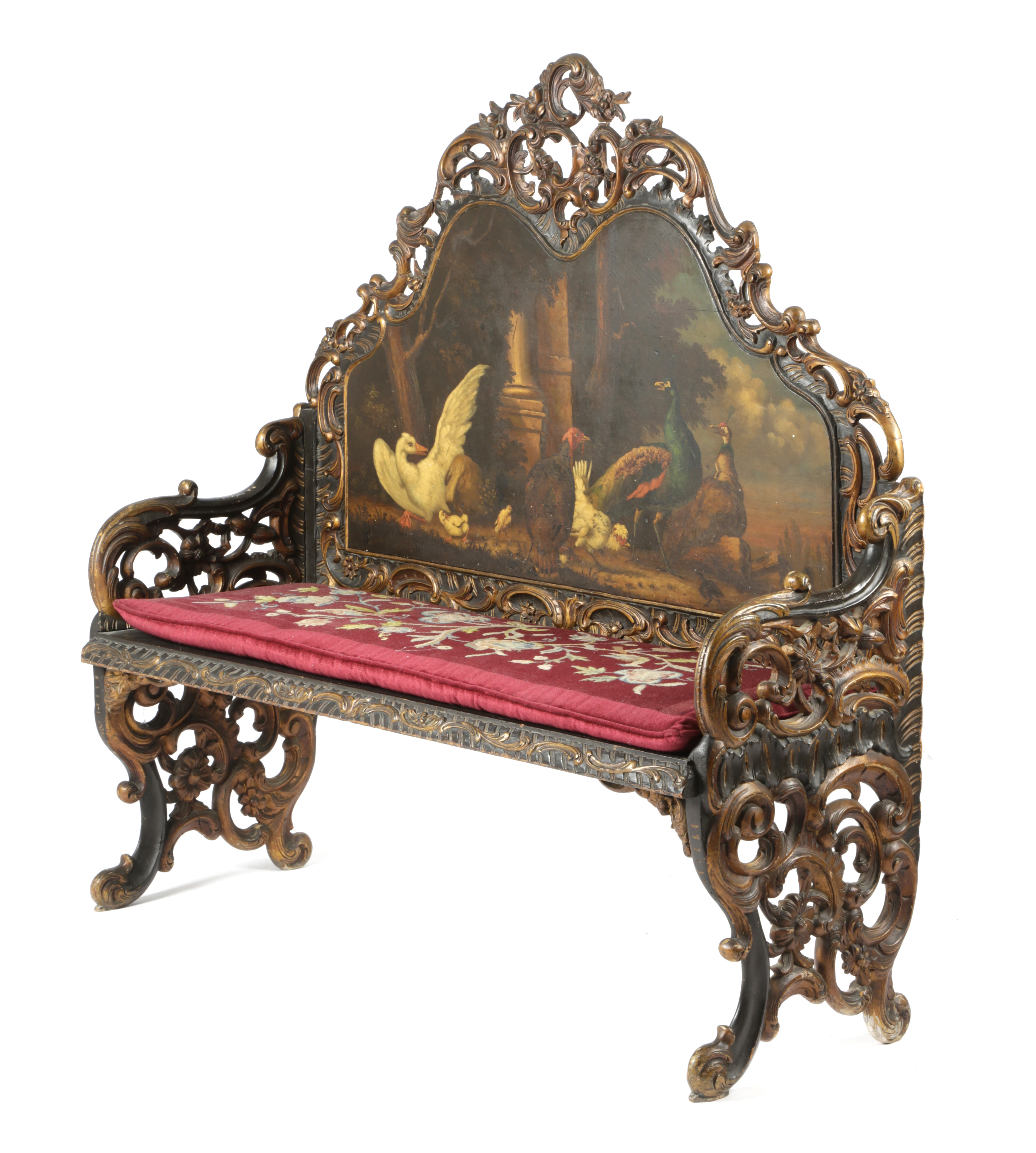 the shaped and pierced back painted with a scene of various birds including a peacock, a turkey and a goose, together with a needlework squab cushion