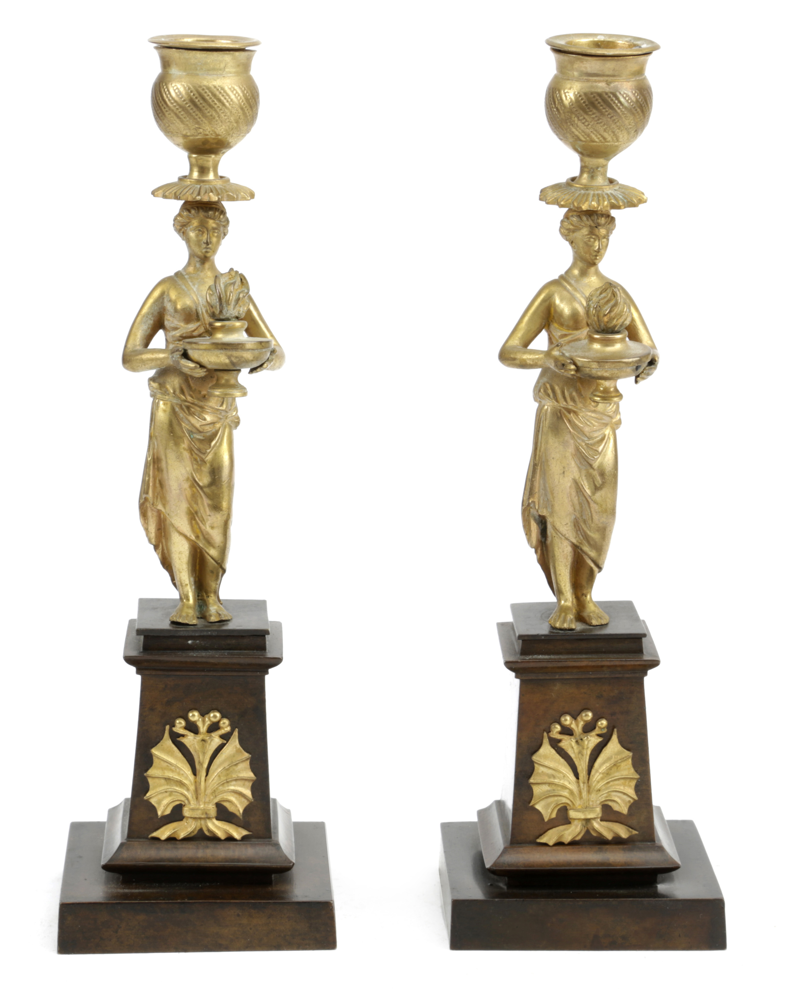 A PAIR OF GILT AND PATINATED BRONZE FIGURAL CANDLESTICKS