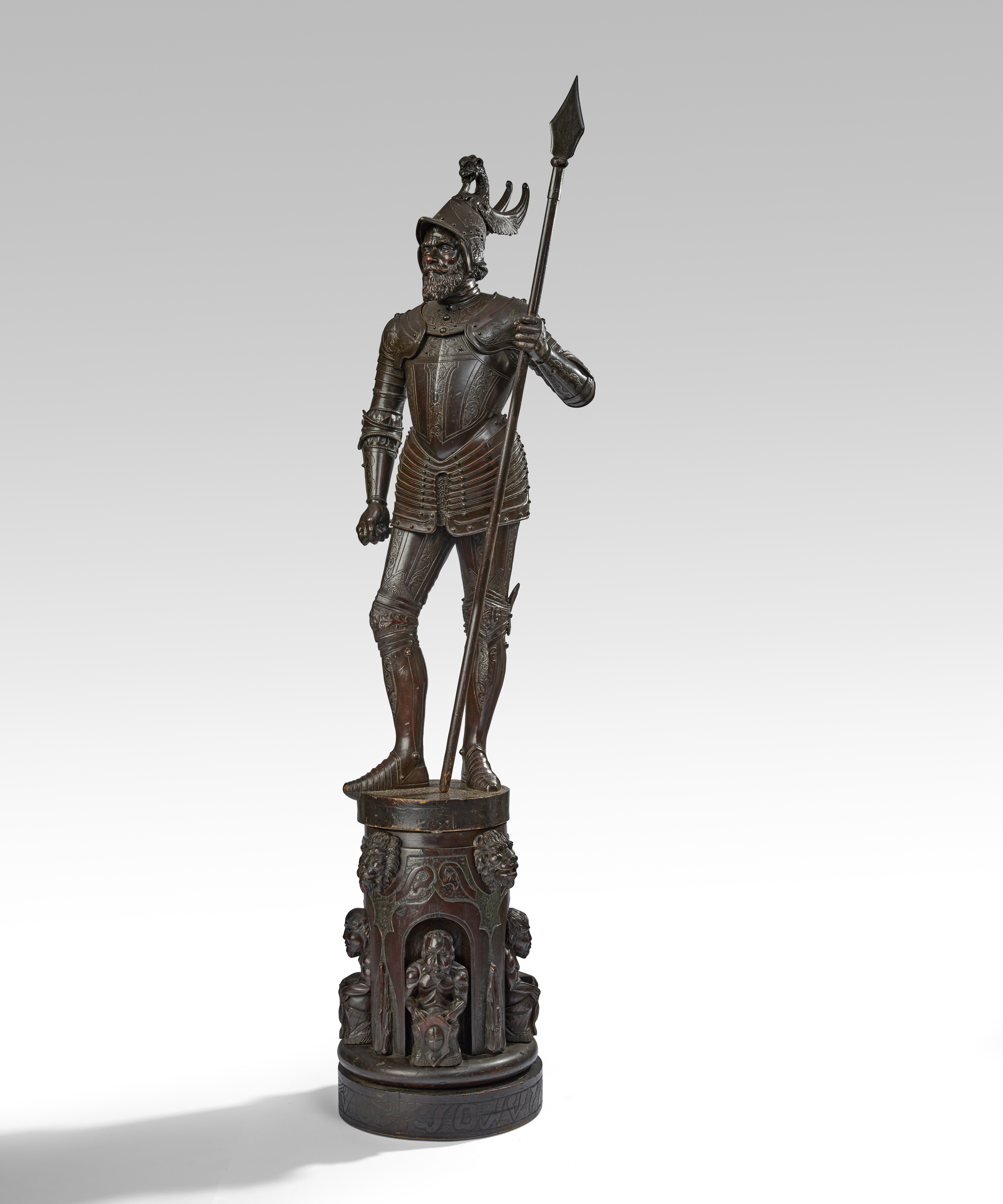 depicting a bearded gentleman in armour holding a spear, mounted on a plinth base carved with lion's masks and slave figures