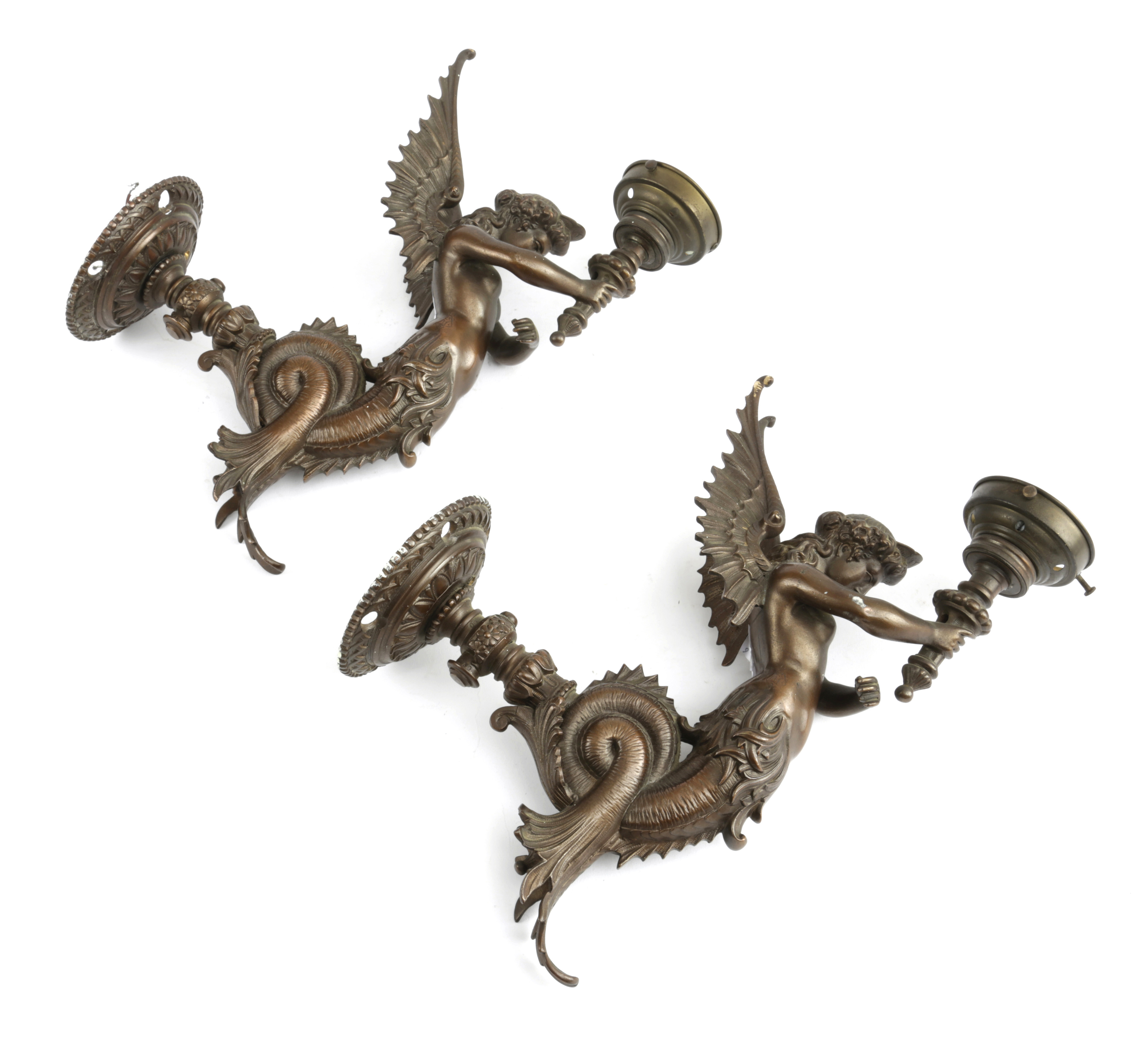 A PAIR OF FRENCH BRONZE FIGURAL WALL LIGHTS