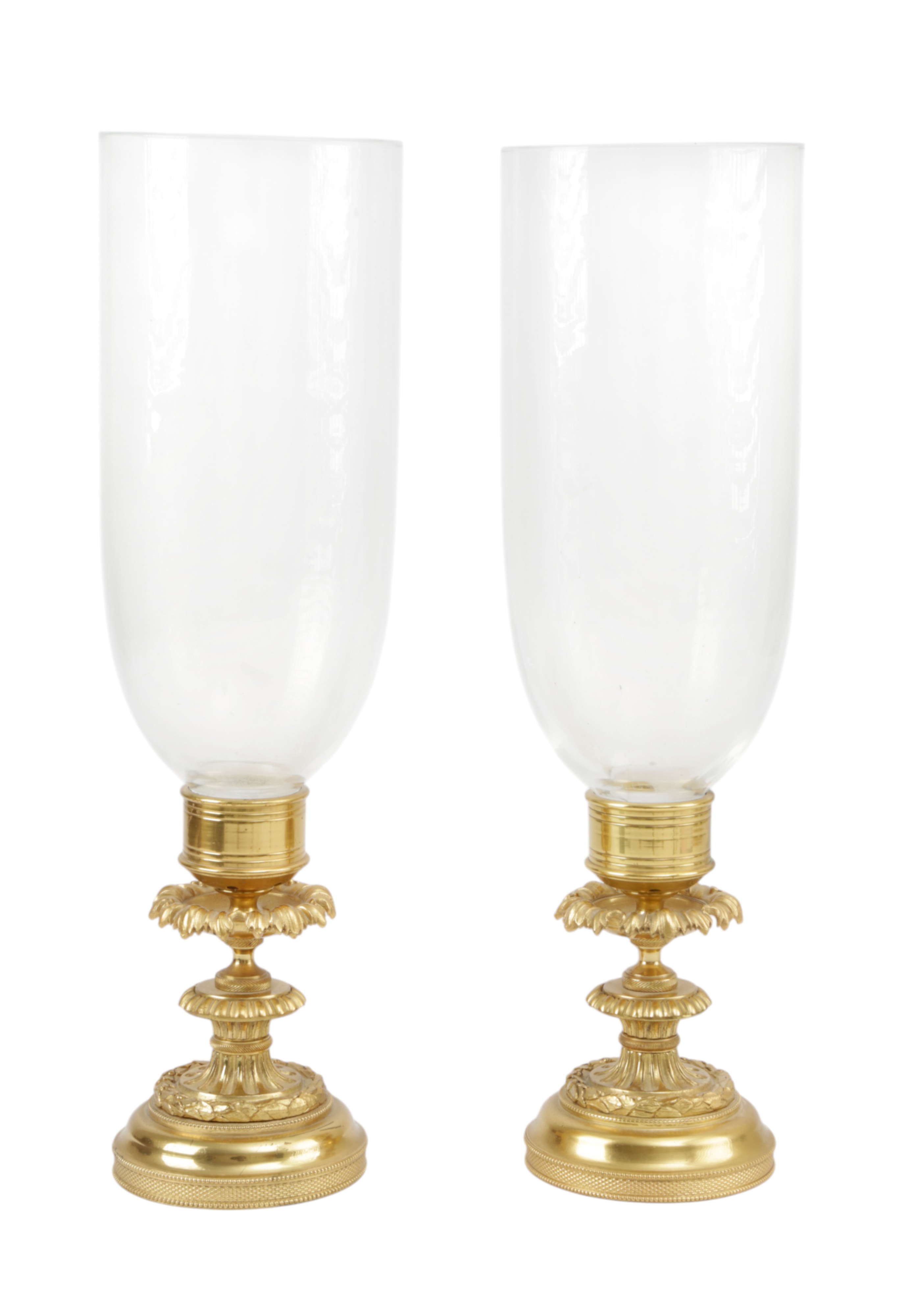 A PAIR OF WILLIAM IV GILT BRASS AND GLASS STORM LANTERNS