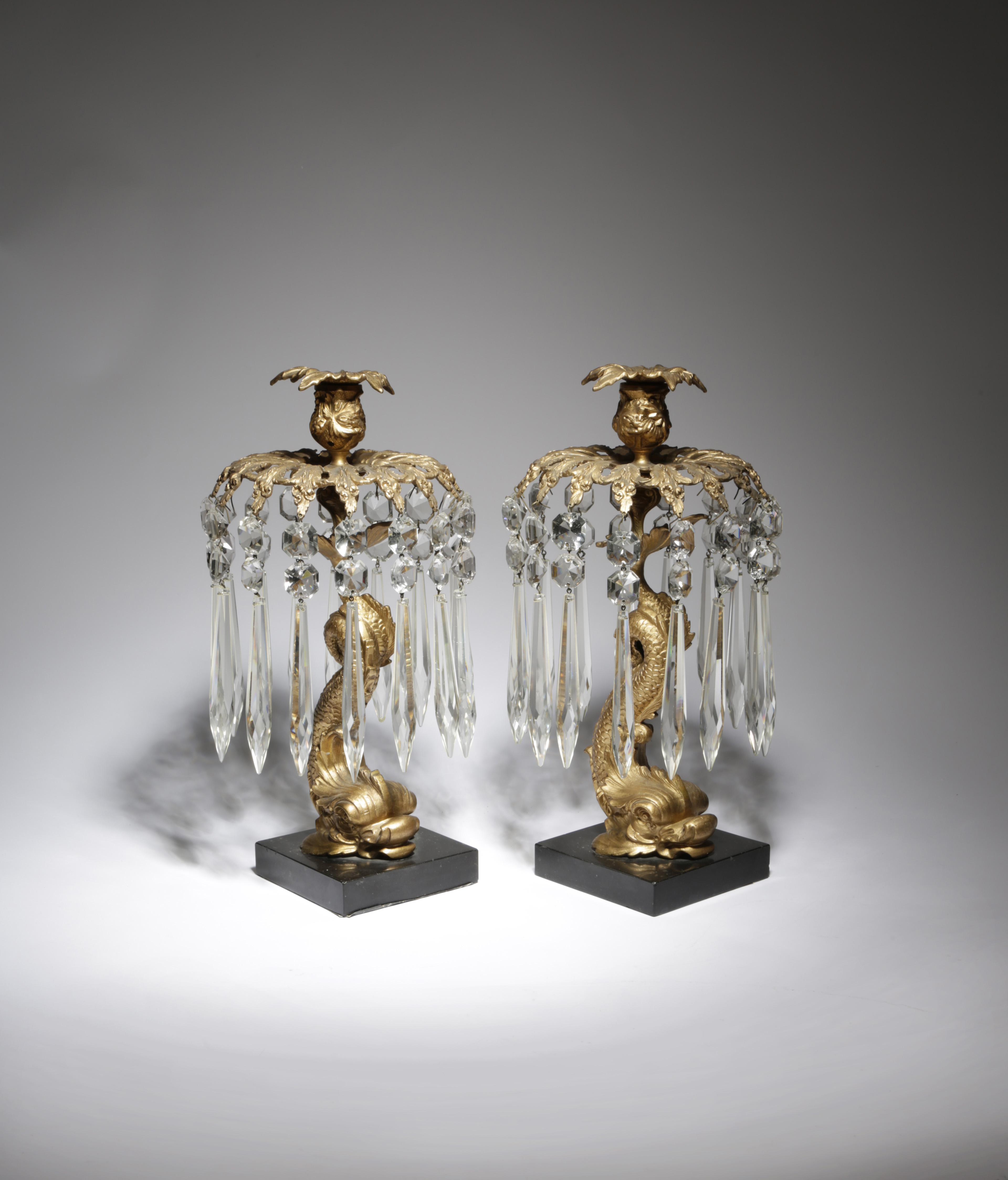 A PAIR OF VICTORIAN ORMOLU AND CUT GLASS LUSTRE CANDLESTICKS