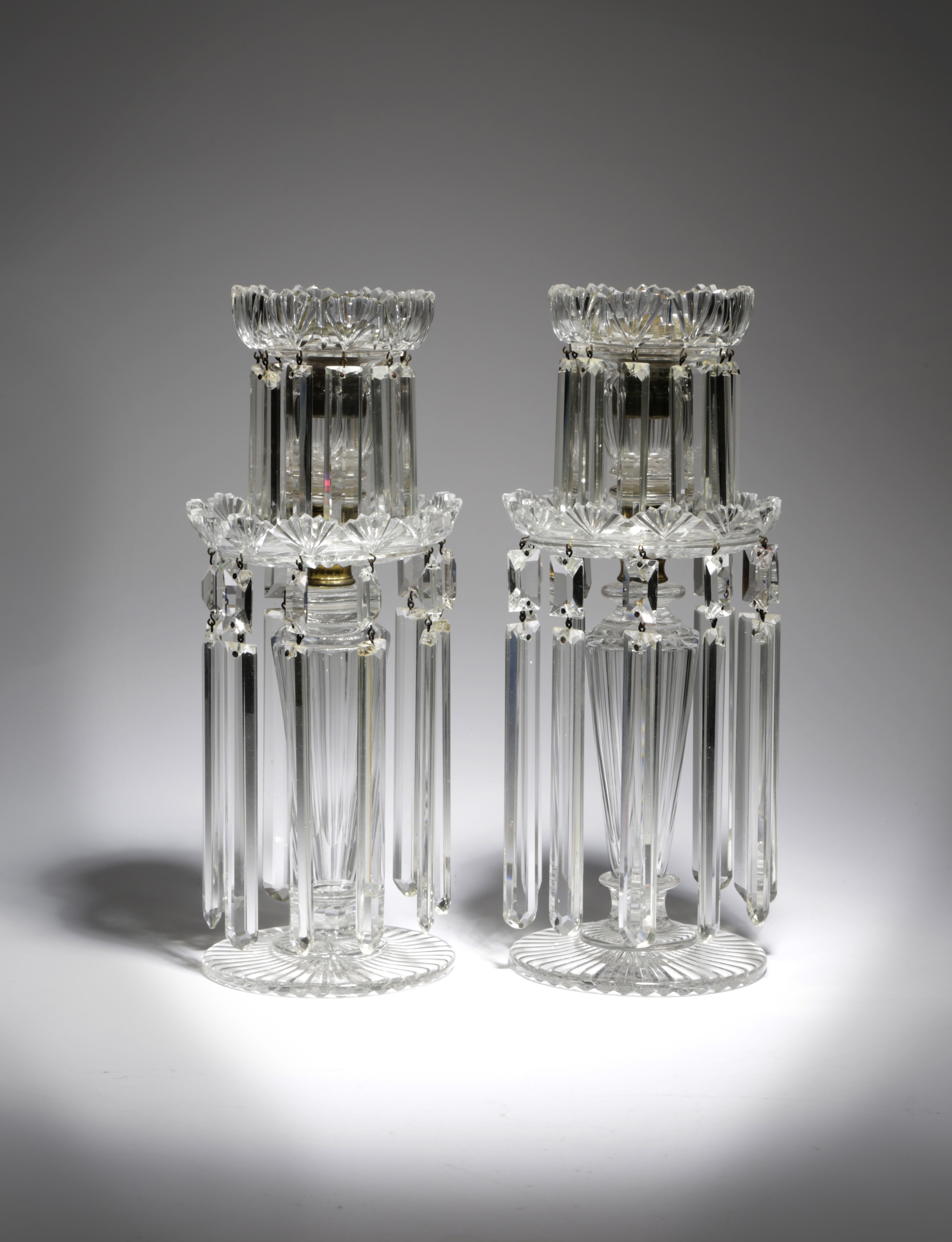 A PAIR OF VICTORIAN TWO-TIER TABLE LUSTRE CANDLESTICKS