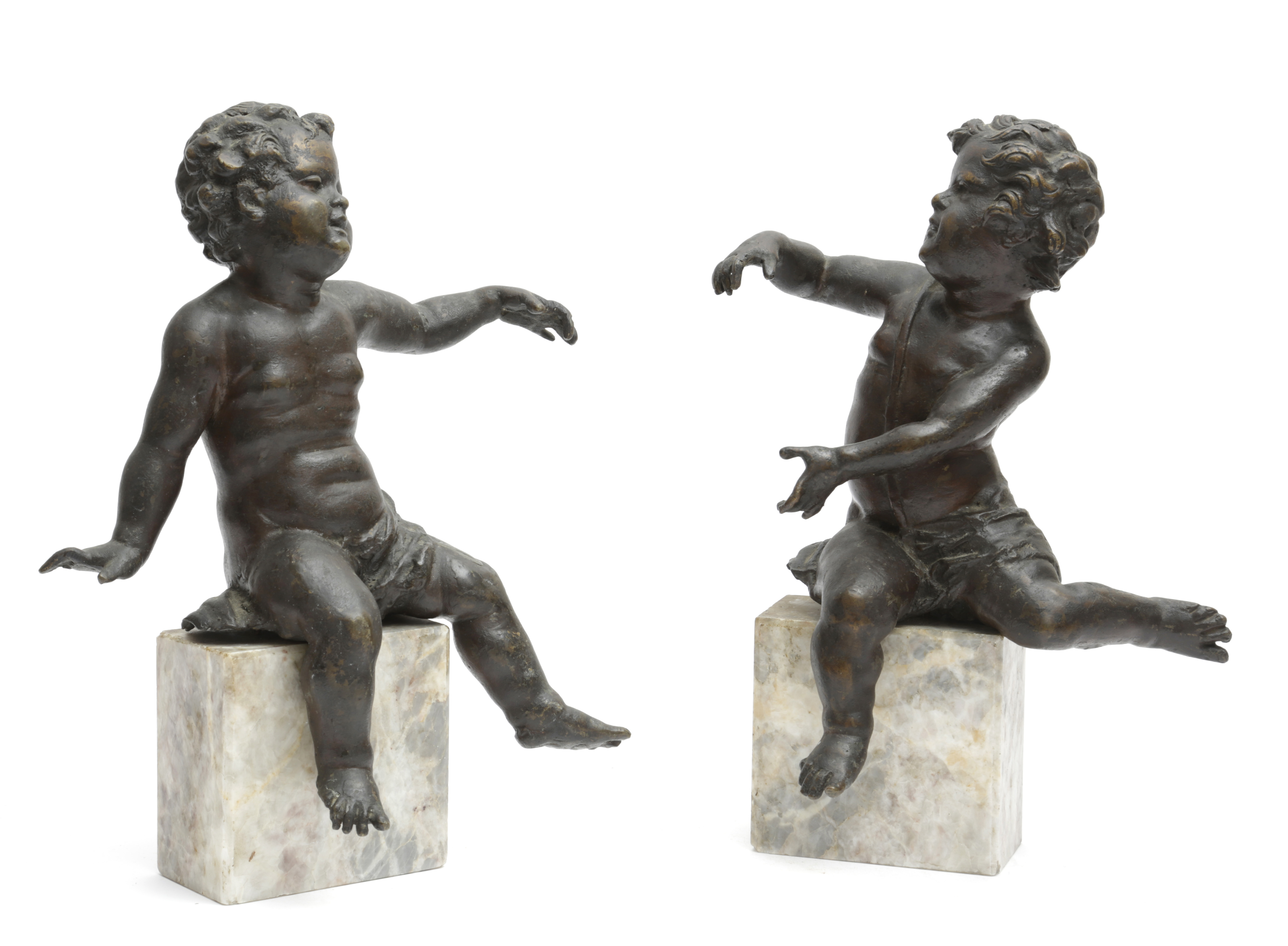 each modelled seated, mounted on a later, grey marble rectangular plinth (2)