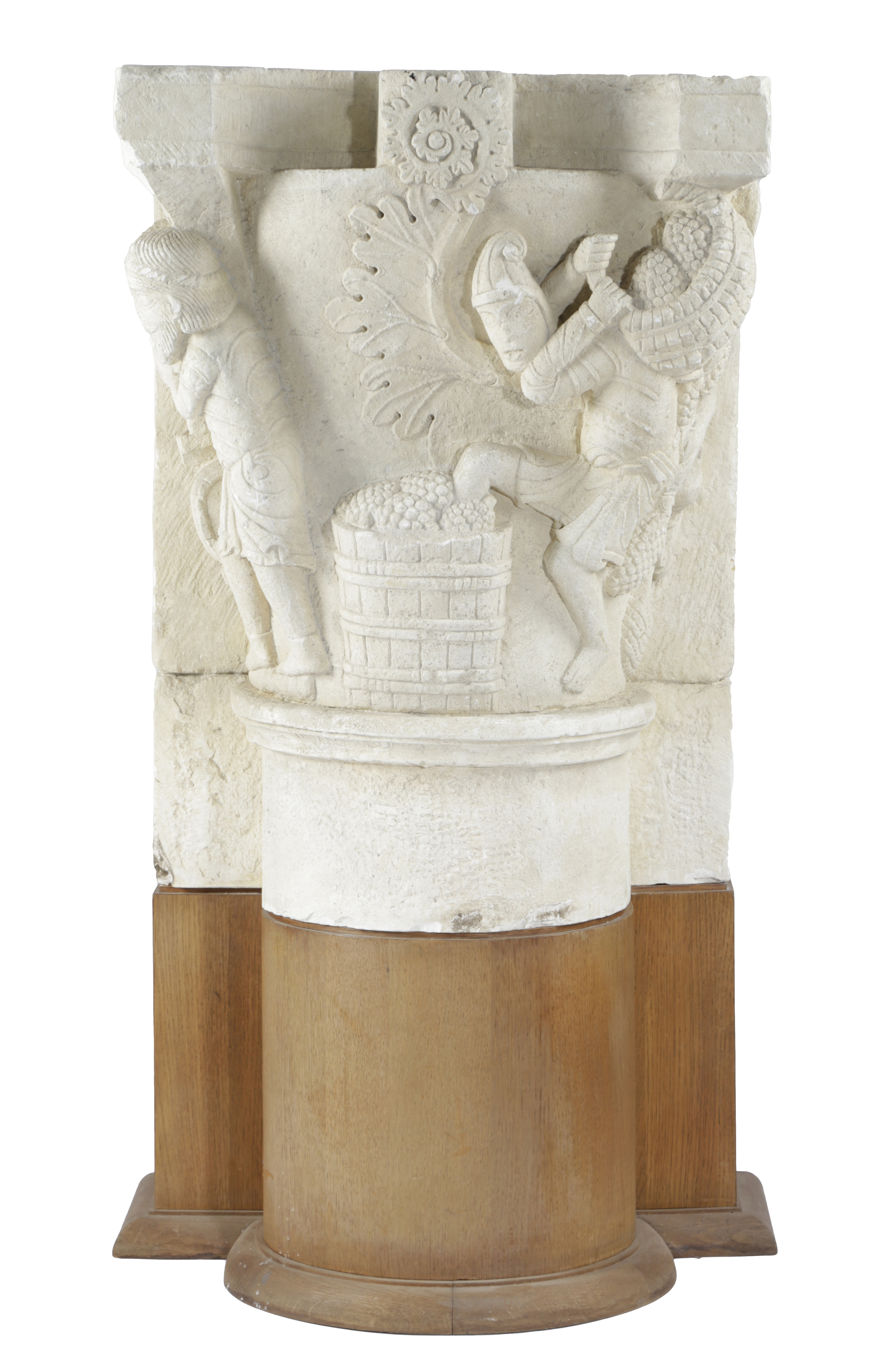 carved with figures making wine, stamped 'Musee du Louvre, Reproduction, Ateliers de Moulage' together with an oak plinth (2)