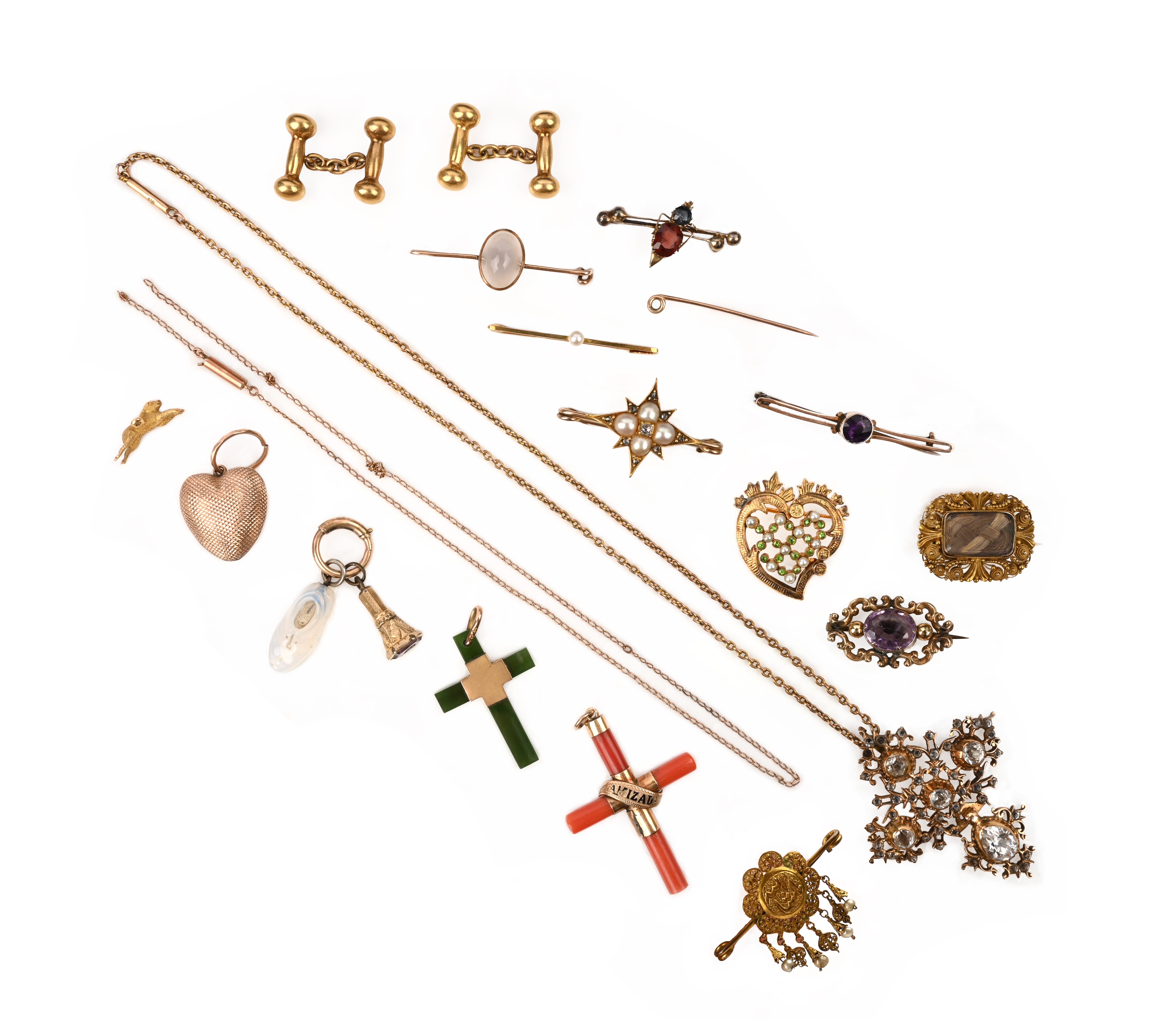 A collection of jewellery, comprising: Child & Child, a demantoid garnet and seed pearl brooch, of heart shaped design, in yellow gold, maker's mark for Child & Child, width 2.5cm, gross weight 6g, enamel stripped, fitted case stamped Child & Child; a cruciform gold pendant set with white paste, to a fine link gold chain, pendant length 5.3cm, chain length 45cm; a heart-shaped locket pendant, to a fine link gold chain, pendant length 3cm, chain length 38, weight 4g, chain broken; two cruciform pendants, one set with coral, the other with nephrite, lengths 5cm and 3.8cm; a gold clasp suspending an initialled gem-set fob seal and a glass shoe-shaped pendant, length 4cm; nine gold brooches, including one centring on a glazed hairwork panel, one set with an amethyst, and one set with diamonds and half-pearls, together with a hare-shaped gold pendant, max. length 6cm, overall gross weight 26g, one pin detached; and a pair of gold cufflinks, terminal width 1.7cm, weight 6g