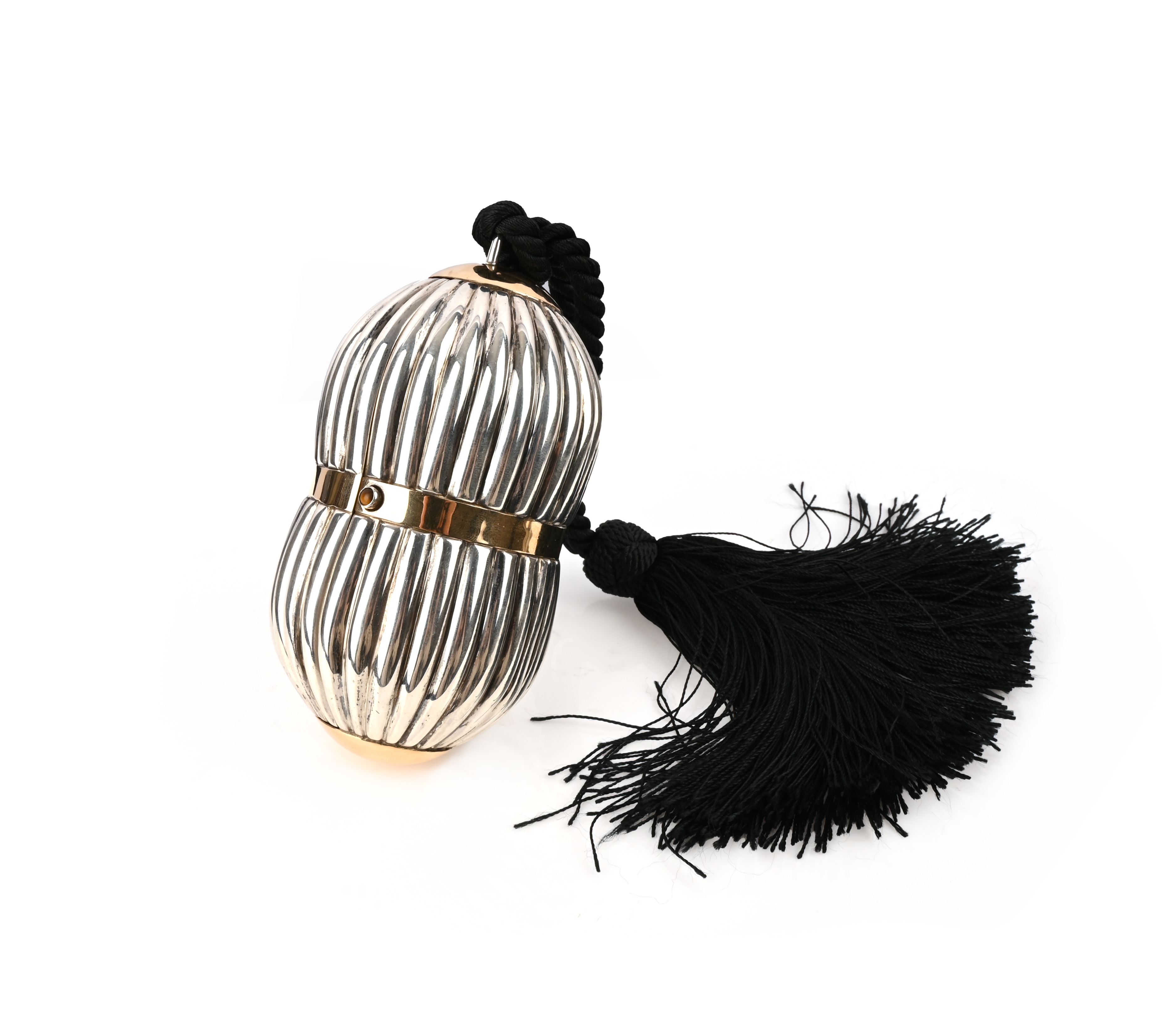 Gucci, a silver evening clutch purse, of reeded and waisted form, with a tiger's eye clasp, stamped GUCCI, 750 and 18k, length 14cm, with a black tassel rope handle