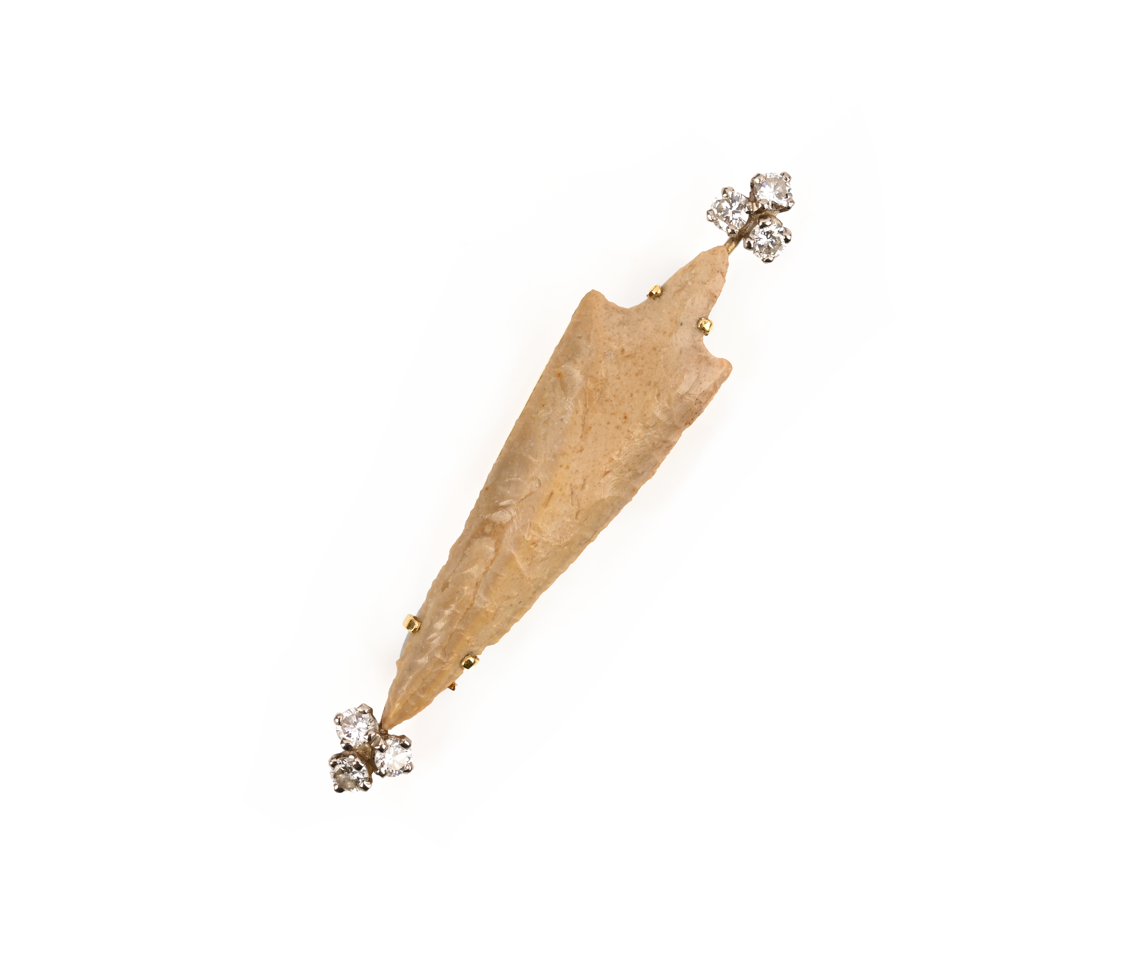 Garrard, a Neolithic arrowhead and diamond brooch, set with a flint arrowhead between two clusters of round brilliant cut diamonds, mounted in gold, signed Garrard Millennia No.56, stamped 18ct, width 6.3cm