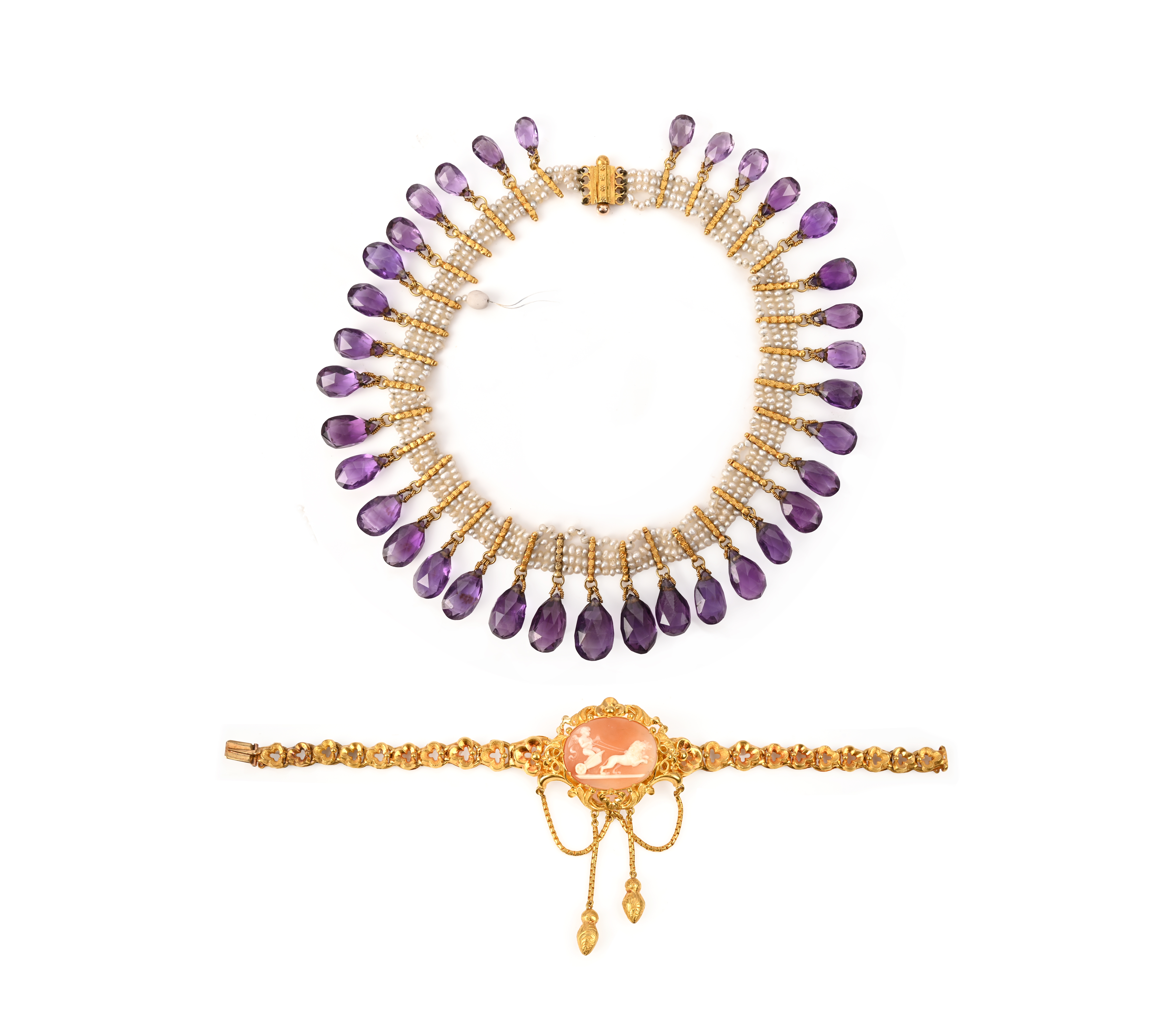 A Victorian shell cameo bracelet and an amethyst and seed pearl necklace, comprising: a Victorian shell cameo bracelet, set with an oval shell cameo depicting cupid on a chariot pulled by lions, within an elaborate scrolling gold repoussé mount suspending gold swags and two drops, to a gold strap of pierced trefoil links, length 18cm; and an amethyst and seed pearl necklace, of fringe design, composed of four rows of seed pearls with gold spacers suspending briolette-cut amethysts, length 31cm, one row detached with some seed pearls lacking