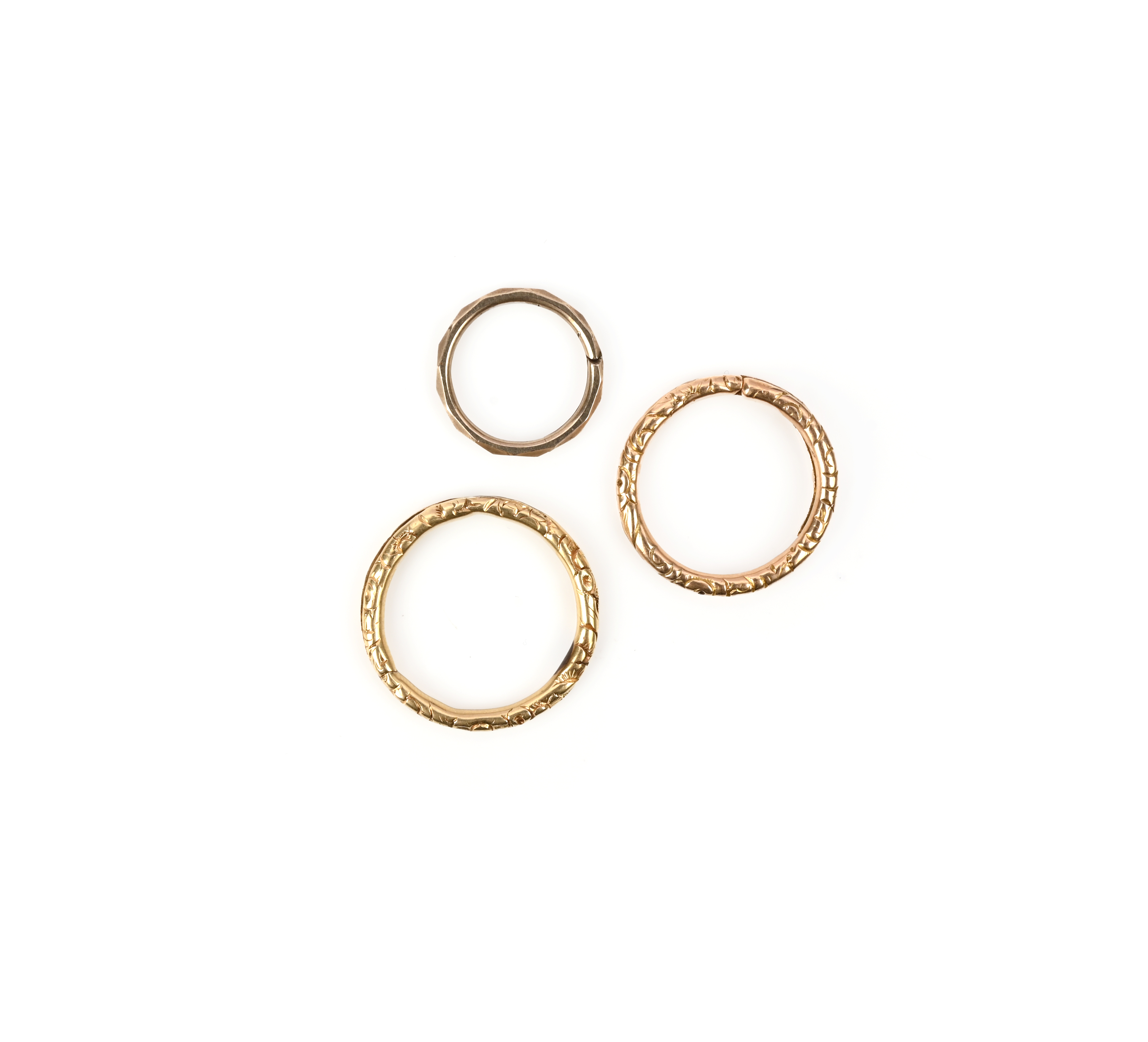 Three Georgian gold split rings, comprising: two rings chased with scrolls and one ring faceted, diameters 2.5cm, 2.3cm and 1.7cm, overall weight 9g