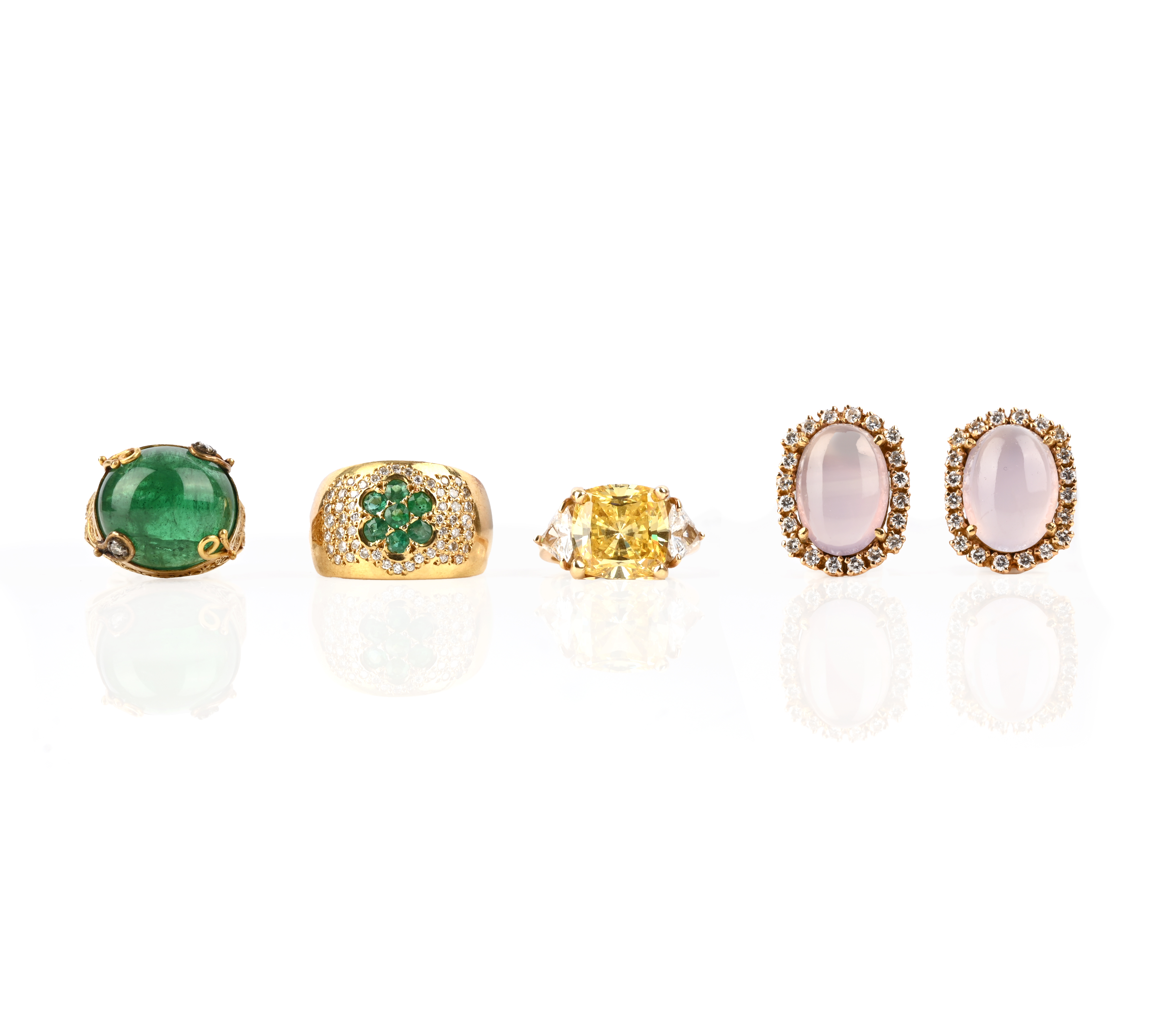 A collection of jewellery, comprising: a pair of rose quartz and diamond studs, each set with a rose quartz cabochon within a surround of round brilliant-cut diamonds, in yellow gold, length 1.8cm; an emerald and diamond ring of bombé design, centred with a stylised floral motif of circular-cut emeralds within a surround of round brilliant-cut diamonds in yellow gold, stamped 750, size M; an emerald ring, set with an oval emerald cabochon in an openwork surround accented with diamonds, size N; and a three-stone ring, set with simulant diamonds, in yellow gold, stamped 14K, size L