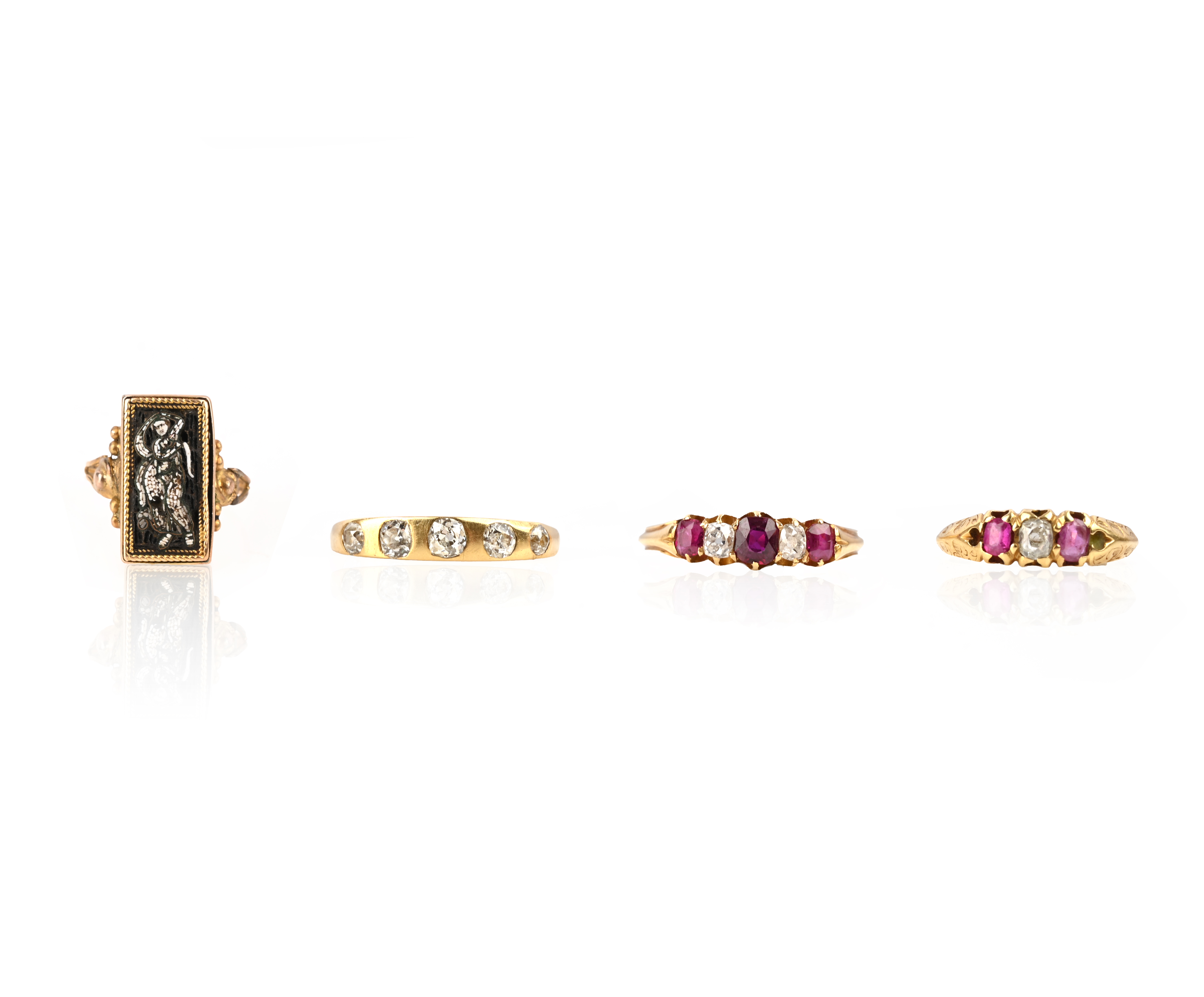 A collection of 19th century gold rings, comprising: a 19th century gold ring set with an old cushion-cut diamond between two cushion-cut rubies in a high setting chased with scrolls, size H, case; a five-stone ruby and diamond ring in yellow gold, size O 1/2, case; a five-stone diamond ring with rubover settings in yellow gold, size M; and a gold ring set with a micromosaic panel depicting a classical figure, size E 1/2